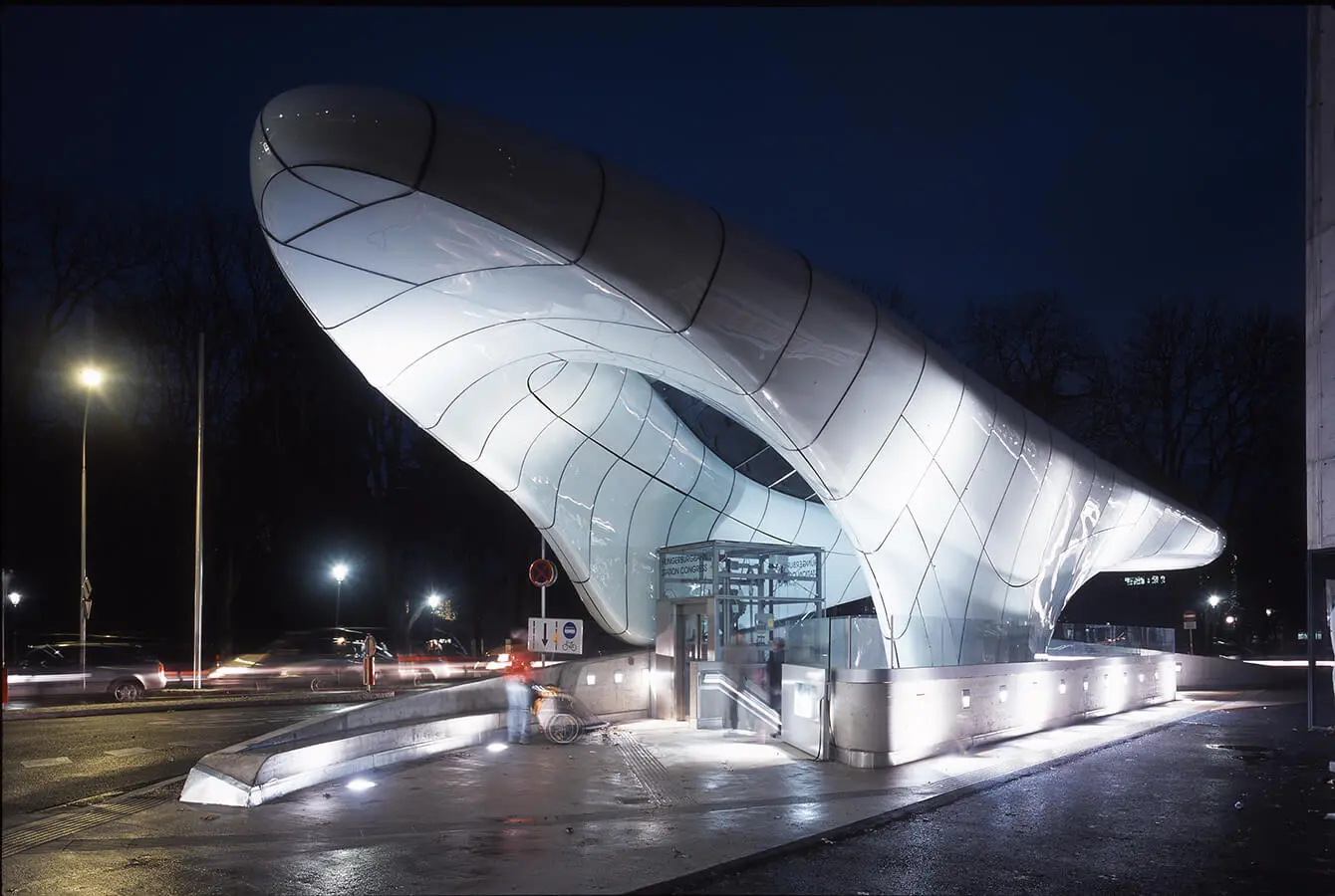 Preseleccionado para el Premio Stirling 2008 por el Instituto Real  de Arquitectos Británicos, el diseño de cada estación se adapta a su propio contexto, topografía, altitud y circulación de pasajeros únicos, con techos que hacen eco de formaciones de hielo natural, como glaciares o arroyos de montaña congelados. La estructura ligera de techo de cada estación «flota» sobre un zócalo de hormigón, creando un paisaje artificial que describe la circulación de pasajeros adentro. Cuando se completaron en 2007, las estaciones fueron las estructuras más grandes del mundo utilizando vidrio de doble curva en la construcción. Junto con el contratista Strabag, ZHA ganó la competencia para construir Hungerburgbahn en 2005. El uso de nuevos e innovadores métodos de diseño y producción que se han convertido en convencionales, como fresado CNC, termoformado y diseño paramétrico computacional, permitió la precisión en la traducción de las geometrías de fluidos de el diseño en las estructuras construidas.