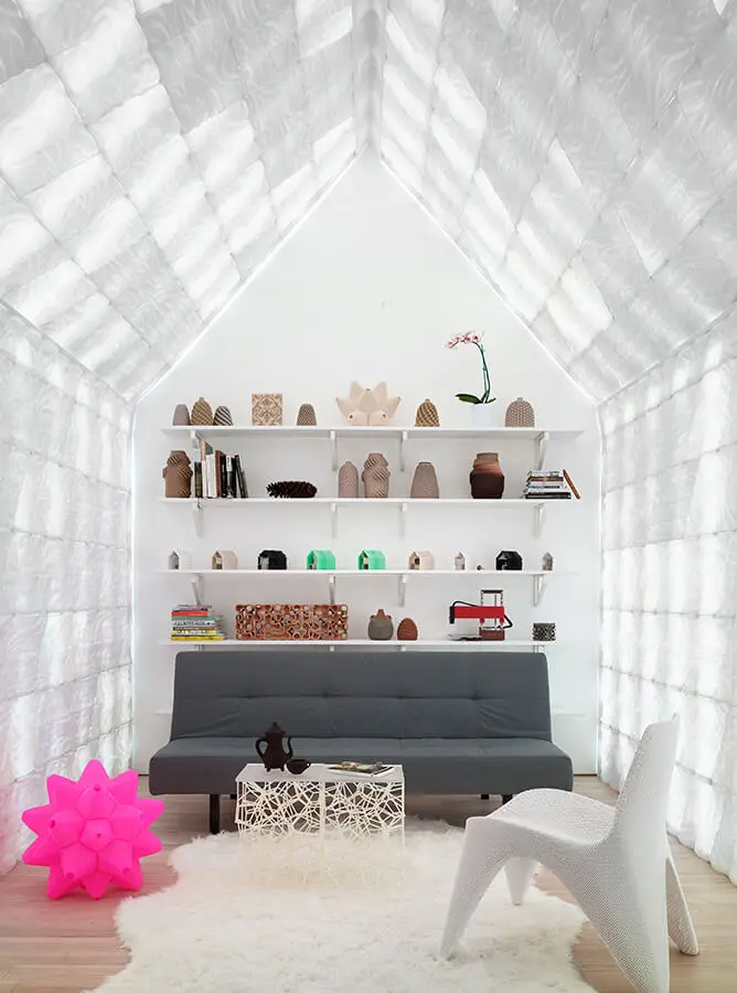 El interior está también cubierto con baldosas impresas en 3D, integradas con un sistema lumínico. La idea de Emerging Objects es no solamente iluminar el espacio, sino darle carácter al exterior, convirtiendo la cabaña en una especie de faro durante la noche. Para amoblarla, el estudio seleccionó una colección de muebles, maquetas y materiales también impresos en 3D, haciendo referencia al título del proyecto y a las curiosidades que contiene.