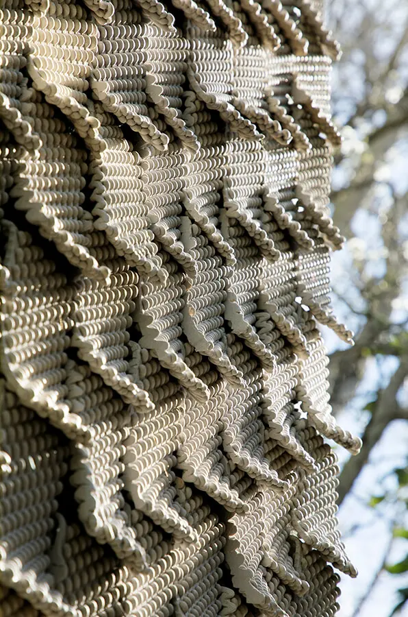 La fachada principal está compuesta por una serie de baldosas/materas que crean una pared viva de plantas locales. Para producirlas, el estudio mezcló varios materiales, entre ellos cemento Portland, aserrín e incluso orujo de uvas chardonnay. El techo y los muros laterales están revestidos con pantallas de cerámica impresa en 3D, inspiradas en la técnica de bordado seed stitch. Diseñadas para un fácil montaje, pueden utilizarse en el exterior o el interior de un edificio. Un código especial fue usado para controlar cada línea de arcilla, creando una textura repetitiva, pero con pequeñas variaciones. Aunque todas se imprimen desde el mismo archivo, cada una es intencionalmente única.