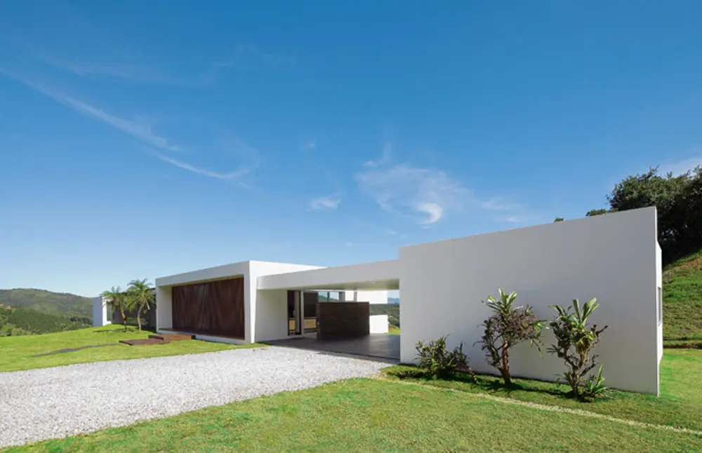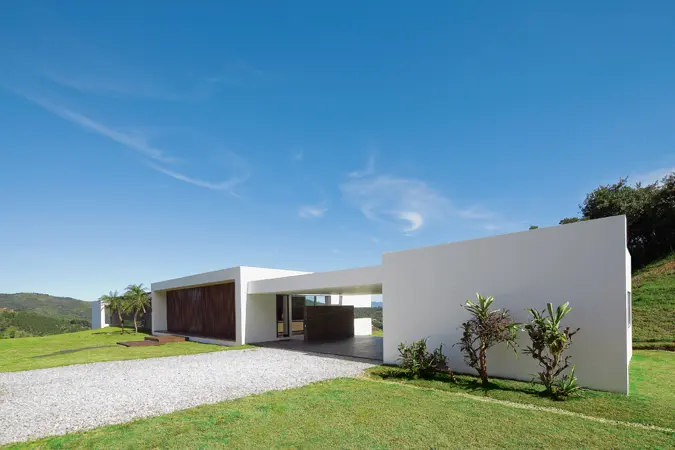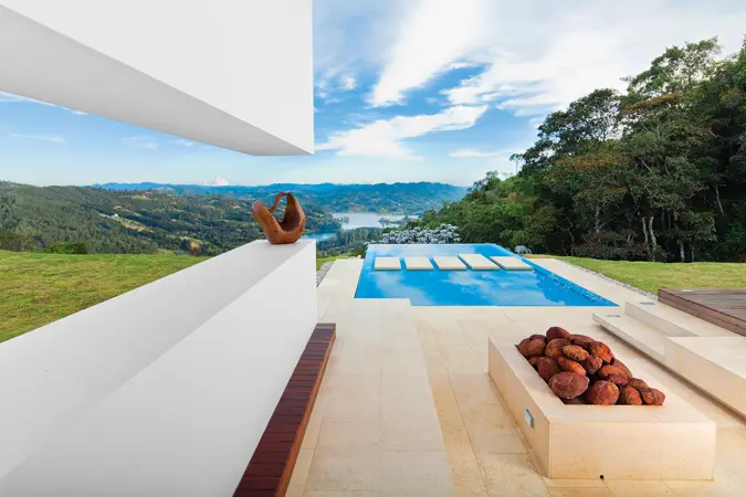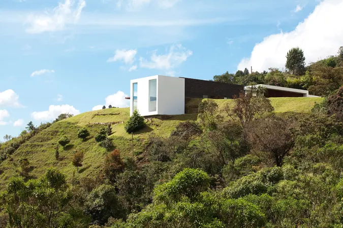 Ubicada a menos de una hora de Medellín, esta casa brilla por sus fachadas blancas y líneas rectangulares que se deslizan sobre la cumbre de una montaña del oriente antioqueño. Está concebida a partir del paisaje y de la relación armoniosa con la topografía del lugar. La casa se compone de tres volúmenes integrados entre sí a través de corredores interiores y terrazas abiertas al paisaje lejano de la represa de La Fe.