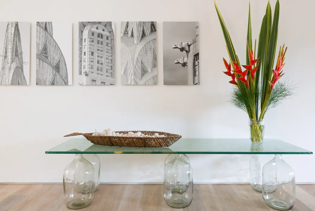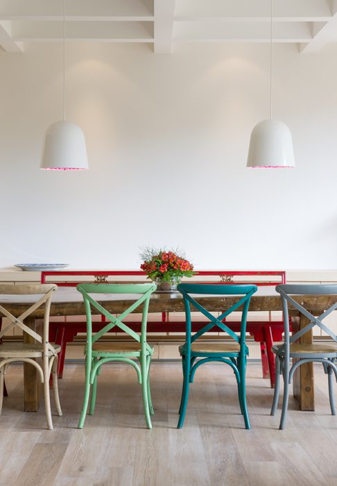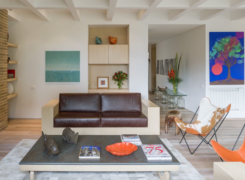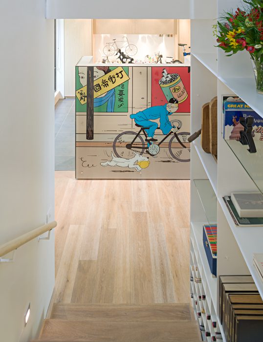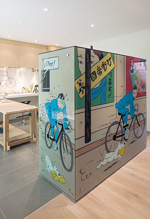 En medio de una estética moderna y sin pretensiones, hay dos detalles que conceden calidez y personalidad: las piezas del mobiliario con un acento vintage –principalmente el comedor– y las múltiples figuras de animales por toda la casa –búho, armadillo, oso hormiguero, pez, rinoceronte, pingüinos y perros, entre otros, delatan el amor de esta pareja por dichas especies–. Y como remate, un toque lúdico: un gran biombo de cristal cubierto con los héroes de la infancia: Tintín y Milú, cuyas aventuras siguen encantando a estos adultos soñadores.