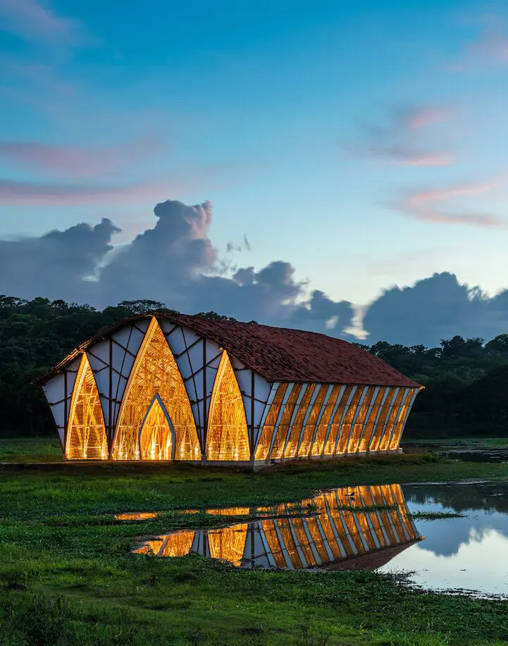 “Amparo Jaramillo Vélez me pidió hacer un espacio provisional mientras arreglaban la catedral”, recuerda el arquitecto manizaleño Simón Vélez. Al recrear las geometrías que la guadua exhibe en su estado natural y utilizar la distribución tradicional de las catedrales –con una nave central y dos laterales de menor escala–, Vélez generó un edificio cuyo carácter y espacialidad respondían a la simbología y necesidades espirituales de los pereiranos. “Solo hice la copia vulgar de un guadual de los que hace mi Dios”.