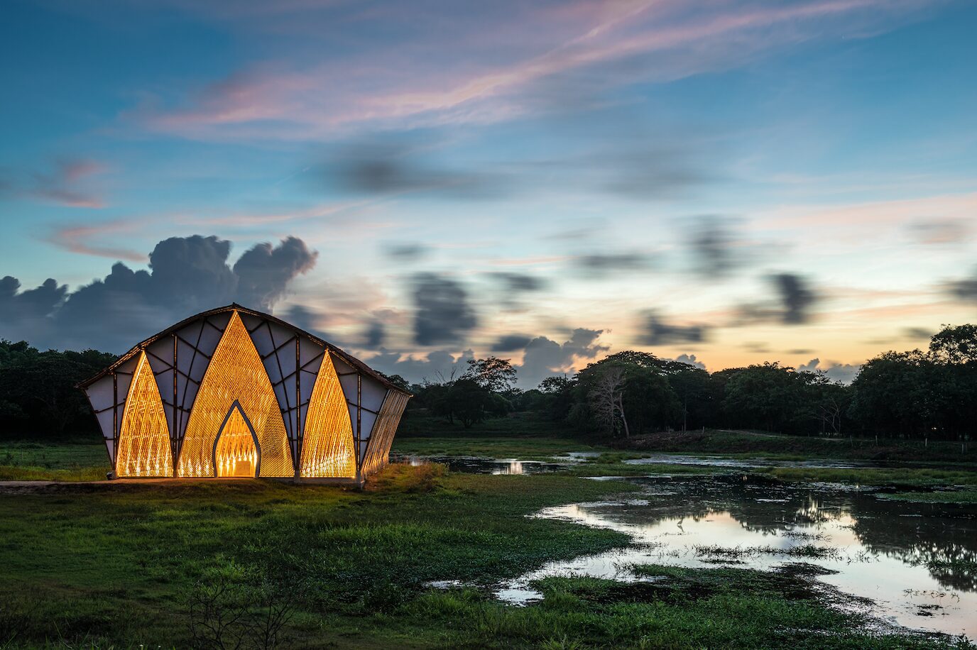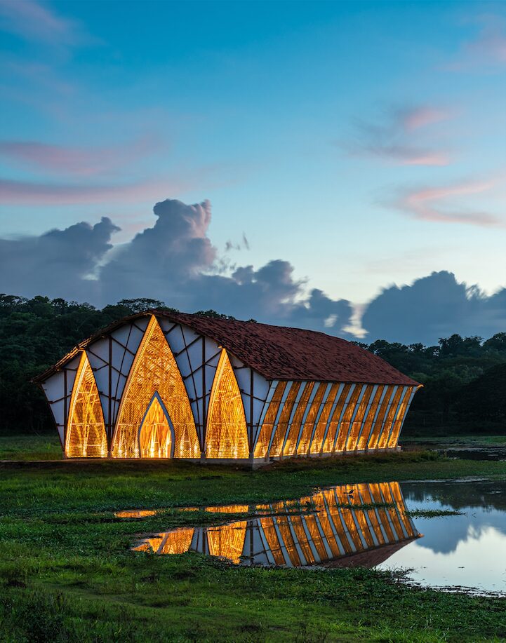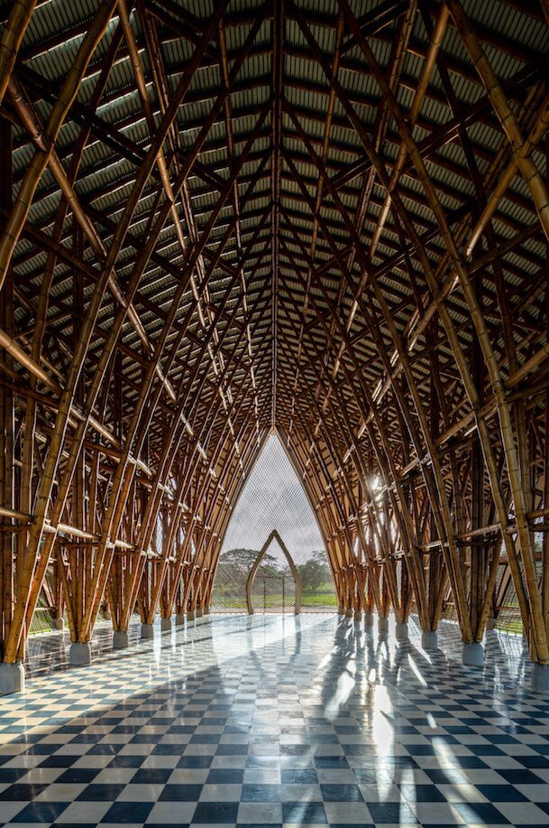 Ahora la catedral no se ubica entre medianeras en un tejido urbano, sino que se posa en medio de la naturaleza, rodeada de vegetación, flotando sobre una laguna artificial que construyeron con posterioridad al edificio para realzarlo. En esta nueva vida siguió manteniendo su carácter inspirador y espiritual, pero desprovisto de relación alguna con la religión. La estructura se posa sobre un piso ajedrezado en baldosa de cemento que se extiende por todo el espacio. “Tengo unos recuerdos muy gratos de la infancia en esos pisos. Es un material sencillo que envejece muy bien”. Sobresalen las bases de concreto con herrajes de bronce que dilatan la estructura e impiden su contacto directo con el suelo, con el fin de prevenir su posible interacción con el agua y la humedad. “La guadua es un material muy noble y resistente, y los únicos problemas que puede llegar a tener se relacionan con los hongos, pero se evitan muy fácilmente con aleros y alejándola del suelo”.