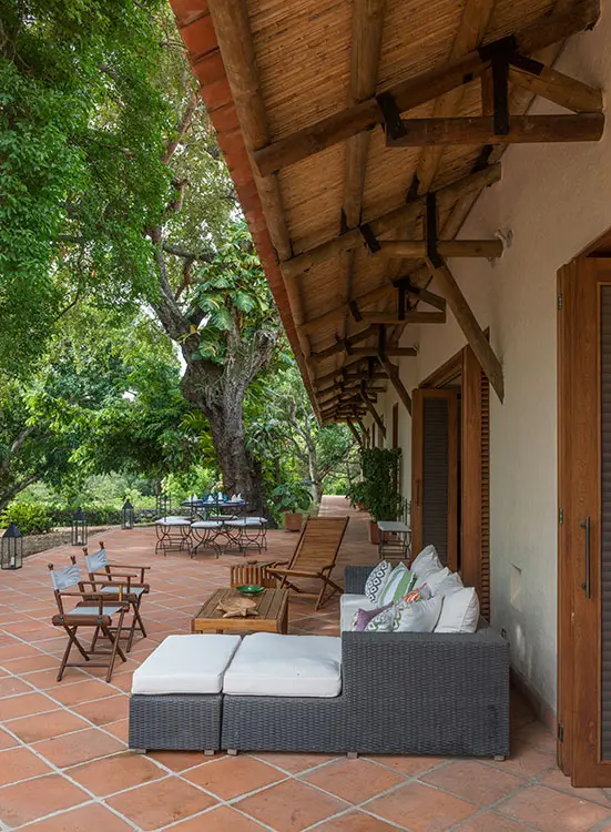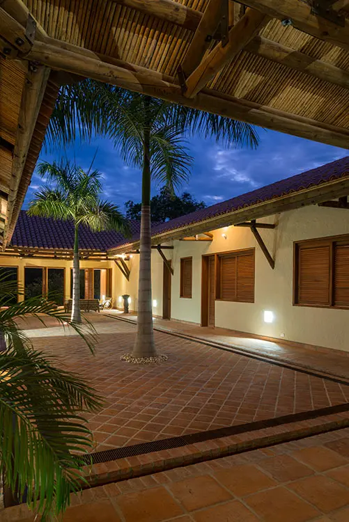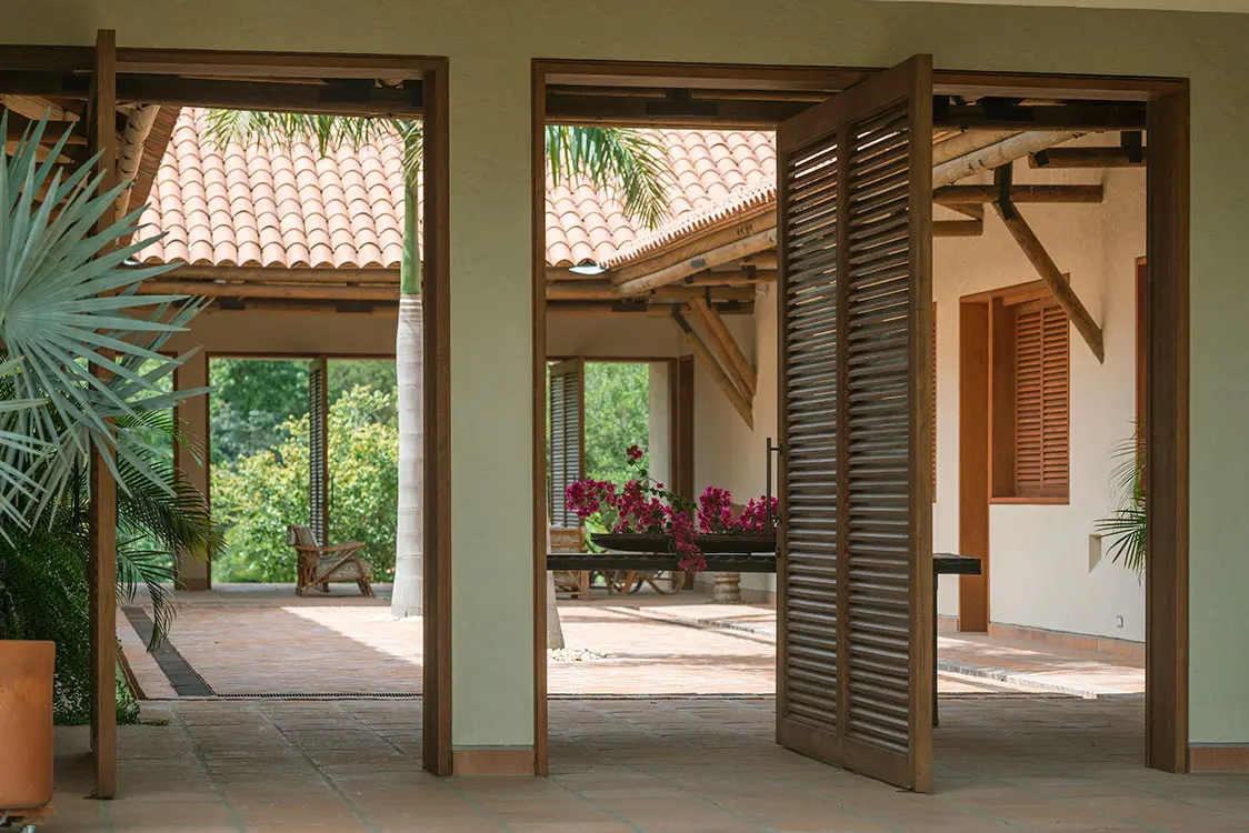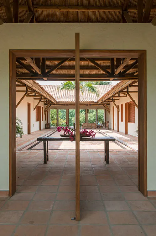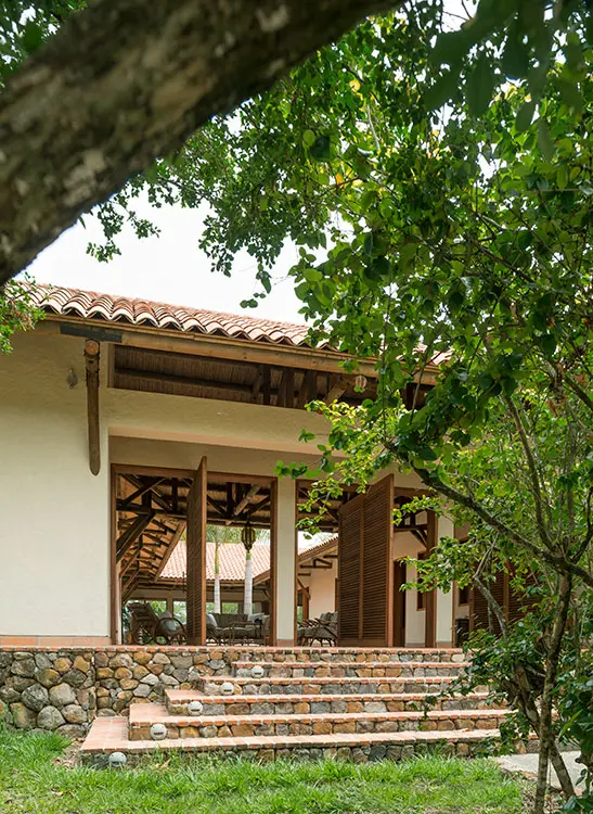 Luego de pasar el lindero de piedra –adaptado con una sencilla puerta de madera–, un rústico y angosto camino entre ceibas centenarias conduce a tres amplias puertas pivotantes de madera, que constituyen el ingreso a la casa. Allí, una mesa indonesia, importada por el anticuario Arte y Ritual, da la bienvenida a un patio creado para establecer el eje que vincula la vivienda con la zona de piscina y BBQ –al fondo– y con los antiguos corrales, también de piedra, que contienen el ganado cebú brahman –ubicados frente a la fachada frontal–. En este espacio, dos palmas reales aprovechan la abertura generada por la cubierta a dos aguas para sobresalir.