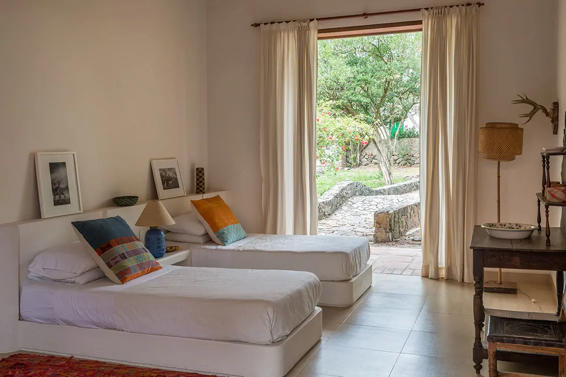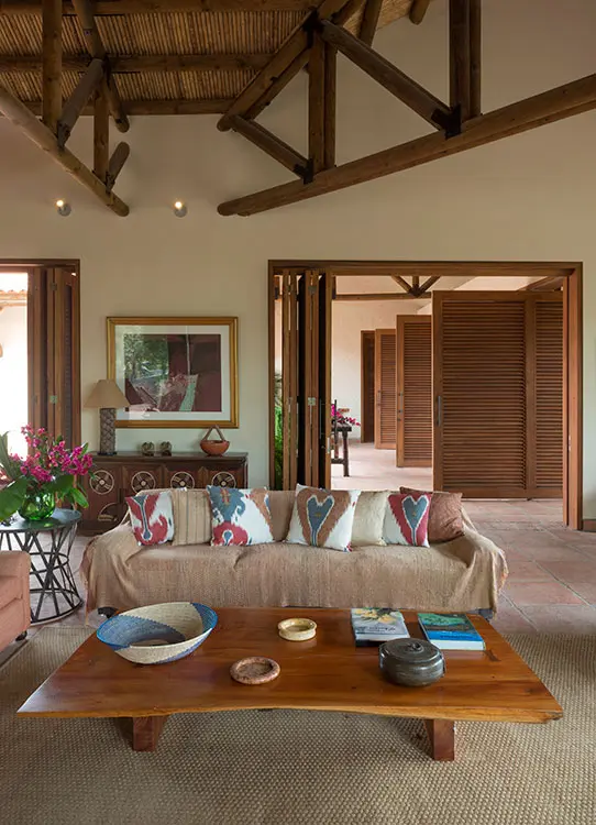 Para enfatizar la relación con la naturaleza, recurrieron a las texturas y los materiales utilizados en el mobiliario y los objetos. Las maderas locales fueron su gran aliado, como se ve en el comedor de diez puestos, con sillas de la diseñadora Yasmin Sabet, o en la robusta mesa de centro de la sala. Para las camas y mesas de noche eligieron la mampostería, gracias a su asociación con este tipo de arquitectura. El diseño estuvo a cargo de Mallarino. “En los dormitorios elegimos colores que recuerdan las flores, y aunque existe un hilo conductor no hay dos iguales. En general, buscábamos una casa con acento tropical, sencilla. Además, los materiales debían soportar el clima húmedo de la región”, añade Echavarría.