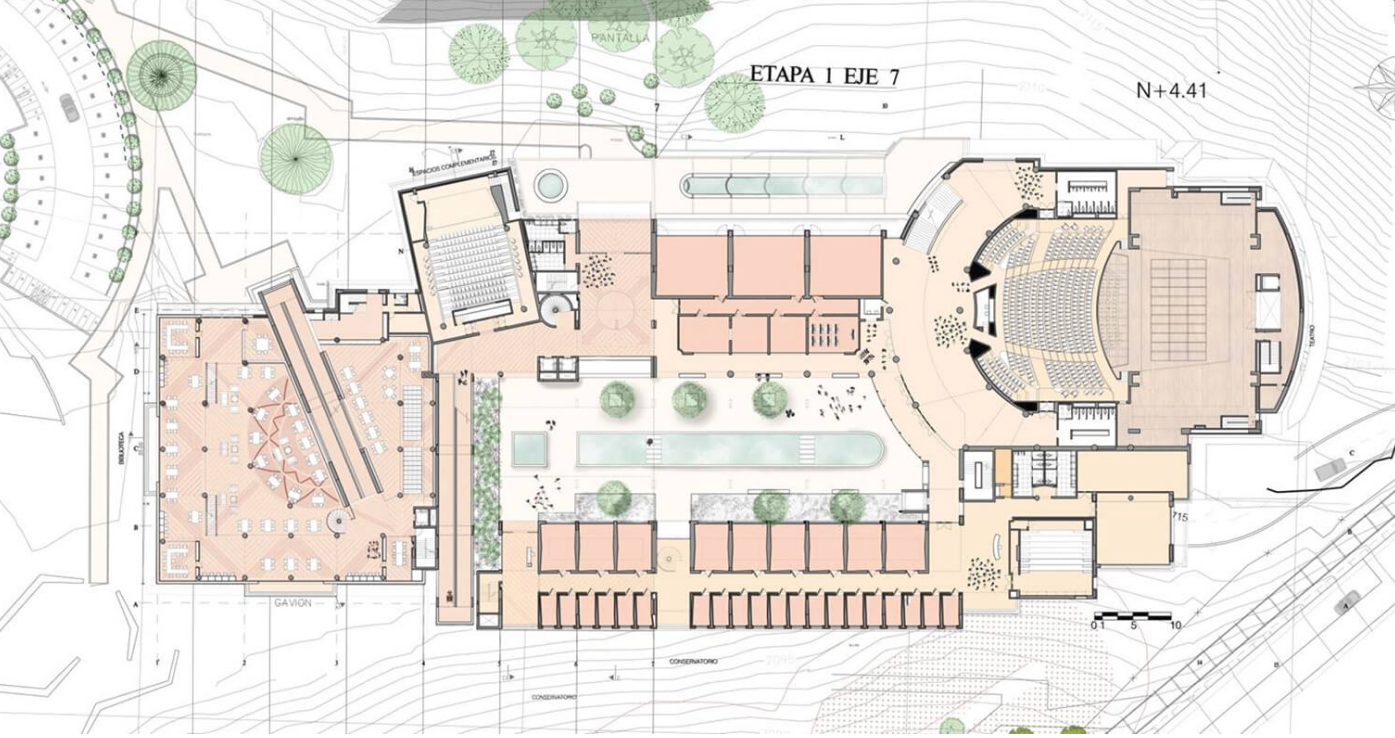 La sumatoria de diferentes formas determina la espacialidad del lugar, al mismo tiempo que induce el movimiento en su interior. Por la manera como se disponen las rampas y circulaciones, atravesando distintas áreas, se entrevé la importancia del recorrido, el cual constituía un elemento compositivo fundamental en las propuestas de Salmona. Para el arquitecto, los recorridos –que aparentaban ser arbitrarios– debían estimular los sentidos, ser inquietantes, incluso desorientadores.