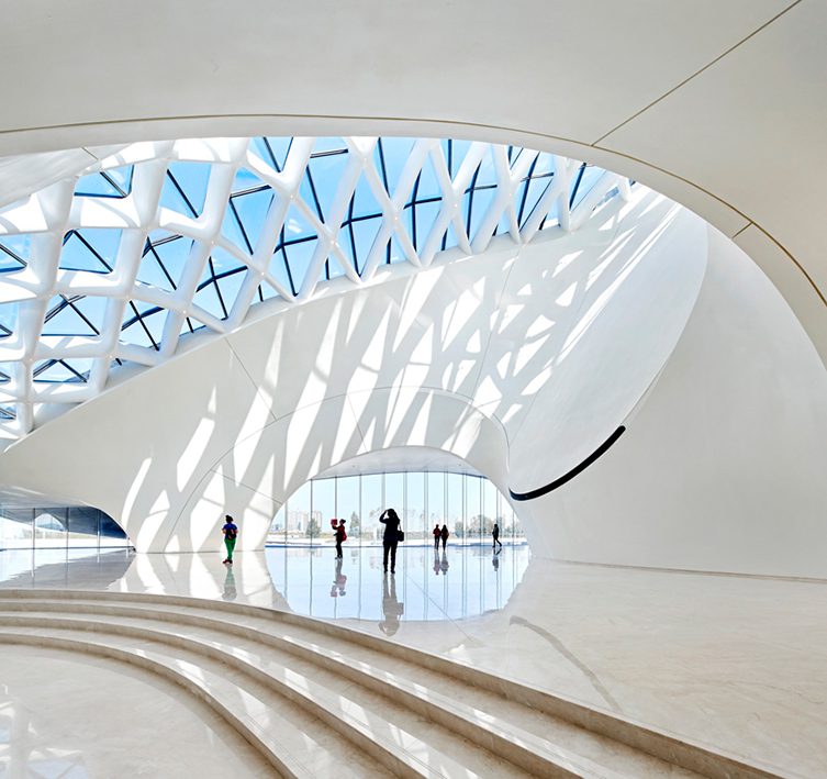 La impresionante construcción de 79.000 metros cuadrados, está ubicada en la ciudad de Harbin, China, un distrito dedicado a fomentar las artes. En el año 2010, La firma MAD, ganó el concurso internacional para crear este complejo cultural cuya forma fluida mimetiza y refleja sutilmente el paisaje de los humedales que rodean el río Songhua respetando su topografía.