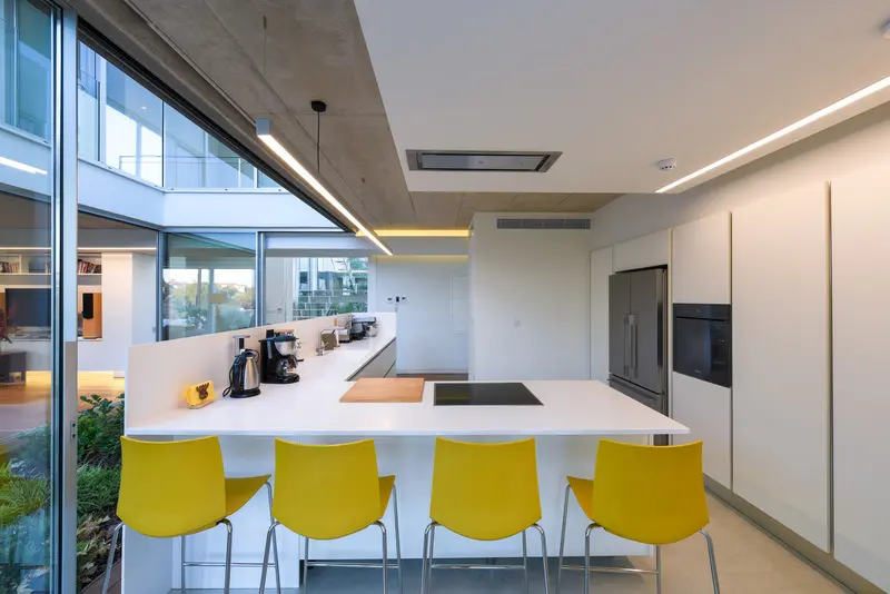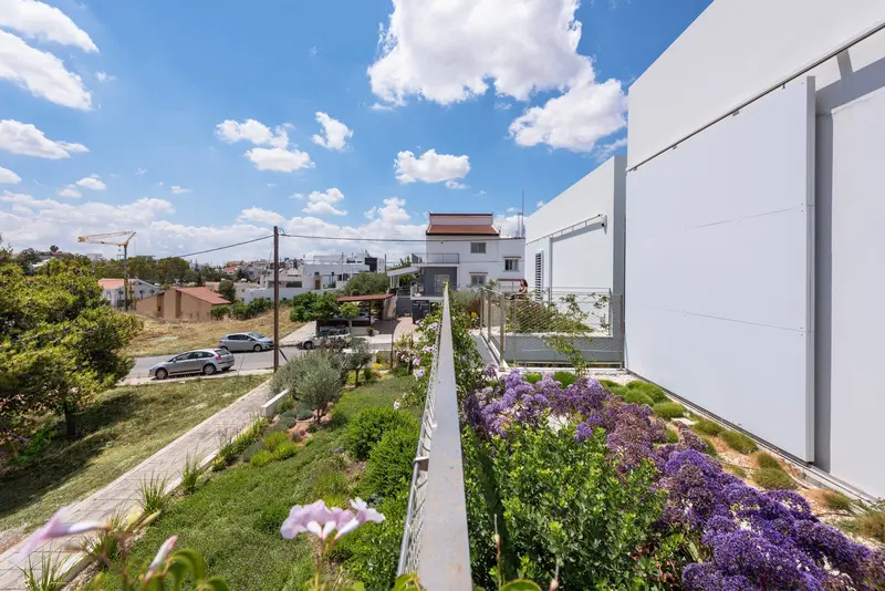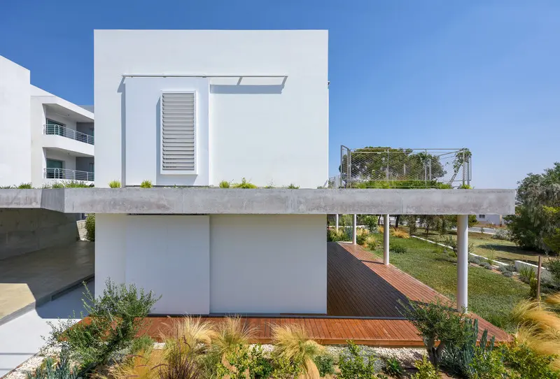 La integración de las zonas verdes en la casa incorpora la plantación de jardines en el 60% de la planta baja, el uso de terrazas verdes en el primer piso, la provisión de paisajes favorables a las abejas y 40 tipos de flores silvestres autóctonas. Todas las áreas interiores fluyen en los espacios exteriores y se organizan alrededor de un patio central verde colocado entre dos volúmenes cúbicos blancos. La creación de un espacio para la naturaleza en la ciudad no sólo aporta belleza a la trama urbana sino que fomenta el retorno de las especies de aves y abejas locales manteniendo así la biodiversidad urbana; además, promueve la salud y el bienestar humanos.
