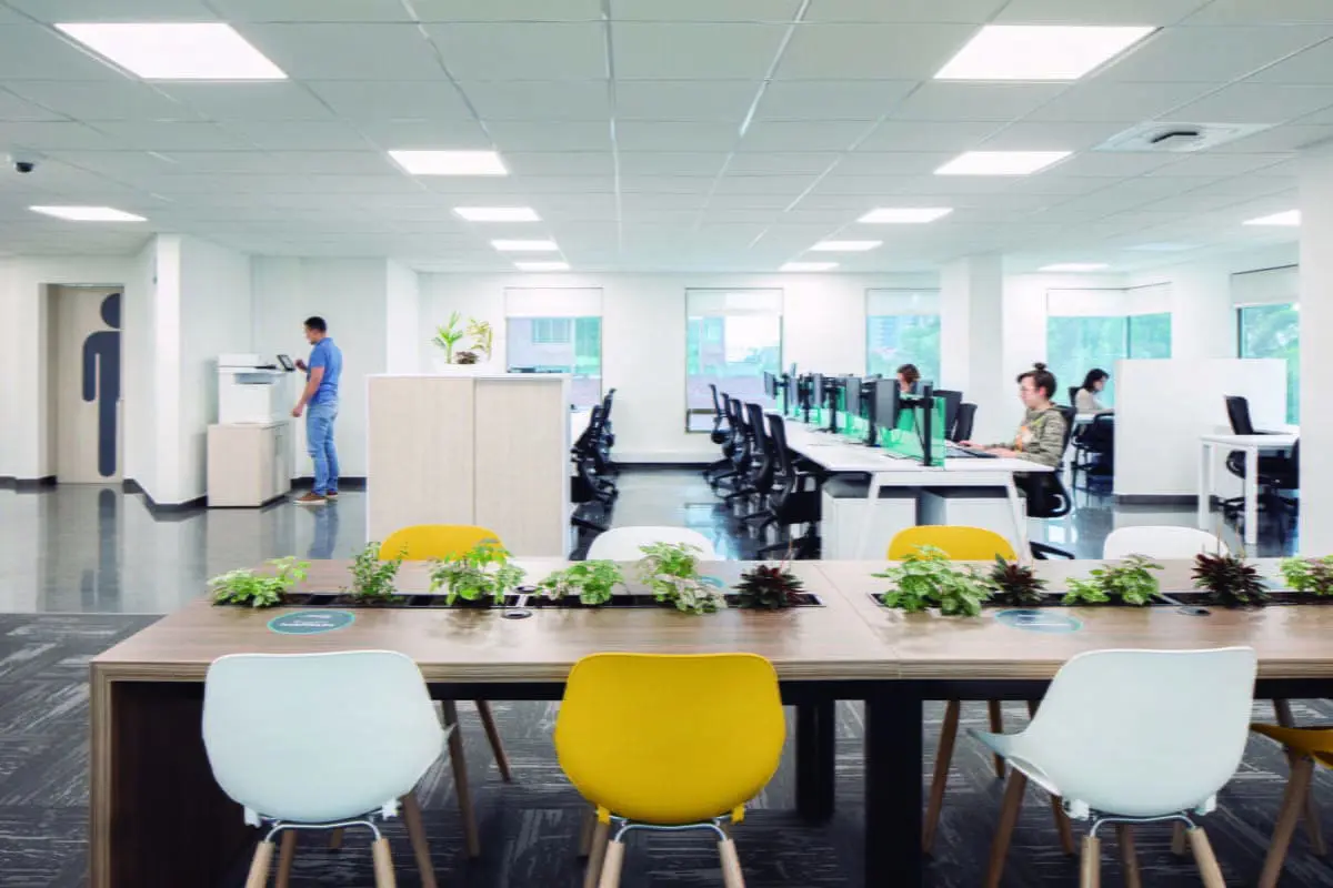 En esta obra de 3278 metros cuadrados, el concepto giró alrededor del trabajo colaborativo, sin perder ciertos espacios privados. “Tenían muchas oficinas. Parte de nuestra labor fue determinar quiénes las necesitaban realmente”. Tras este estudio optaron por mantener las de gerencia, pero con un giro: divisiones de vidrio que permiten la conexión visual entre los equipos. Ahora, a lo largo de todo el proyecto se encuentran diversos espacios colaborativos, desde cabinas para que dos personas tengan reuniones informales, hasta largas mesas donde la naturaleza genera sutiles divisiones. Sobresalen la sala de innovación por su flexibilidad, en la que una gran mesa se puede configurar de múltiples maneras gracias a estar compuesta por otras más pequeñas con ruedas, y el área con columpios, que permite realizar distintas labores, pero con un toque más didáctico y distendido.