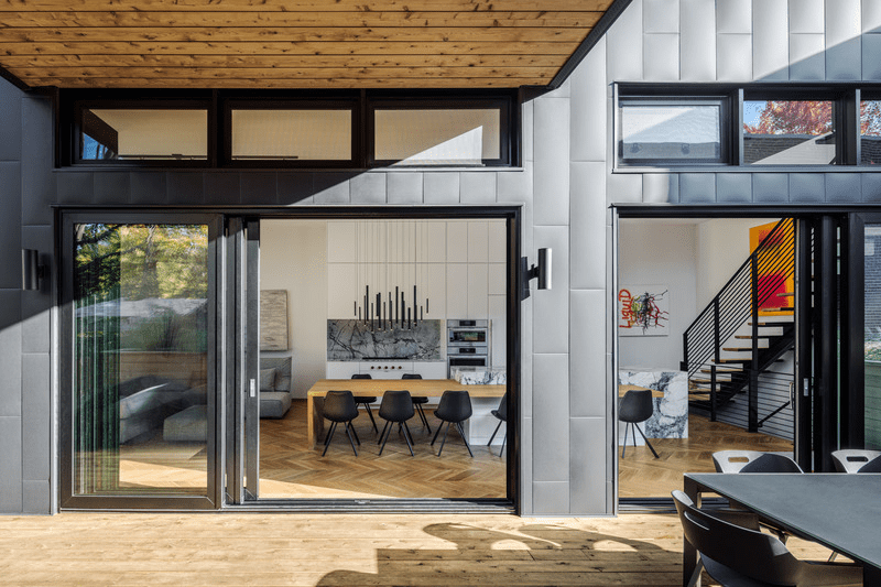El añadido incluye grandes aberturas que proporcionan a todos los espacios interiores una considerable cantidad de luz natural. Un sobrio revestimiento de paneles metálicos negros cubre la adición contemporánea y da al conjunto un acabado impecable.