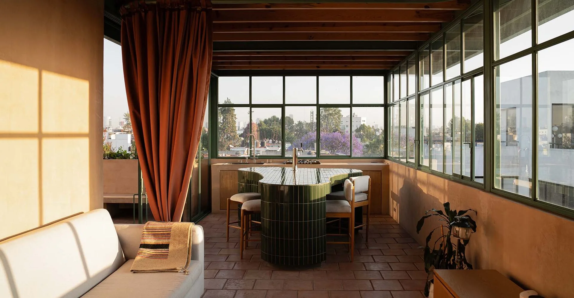 La fachada, ligera y permeable, captura la luz cambiante y la filtra hacia el interior, creando una atmósfera que oscila entre la energía del día y la quietud de la noche. Los ventanales amplios abren el espacio para disfrutar de la vista, mientras los materiales retoman la memoria de lo artesanal, por ejemplo, pisos de barro cocido, muros de estuco, cerámica vidriada verde y vigas de madera expuesta.