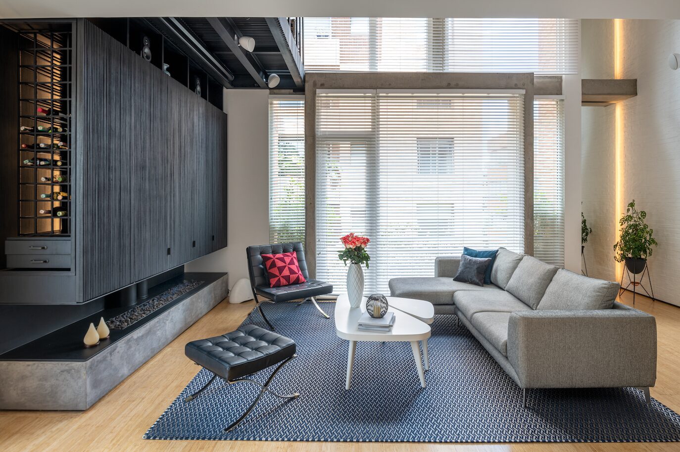 “La fluidez espacial constituye una de las premisas esenciales, de ahí que hayamos procurado eliminar toda clase de divisiones entre las áreas y hacer que los cerca de 140 metros cuadrados que lo componen se lean como una unidad”. Otro aspecto clave en la búsqueda por fusionar el clóset y la chimenea, resalta la doble altura de la zona social y la vista del paisaje urbano exterior. Tal operación fue bastante compleja, pues requirió que dentro de un mismo objeto se articularan diferentes funciones: la chimenea es, además, un mueble donde se alojan una cava de vinos y varios dispositivos tecnológicos. Así, no solo reúne un gran número de actividades que los dueños disfrutan, sino que se funde con el armario mediante una celosía de madera grafilada. Y su tamaño, de grandes proporciones, obedece tanto a la profusión de requisitos que cumple, como al espacio que lo contiene: “Aquí hay una apuesta por manejar la escala de una manera consciente.