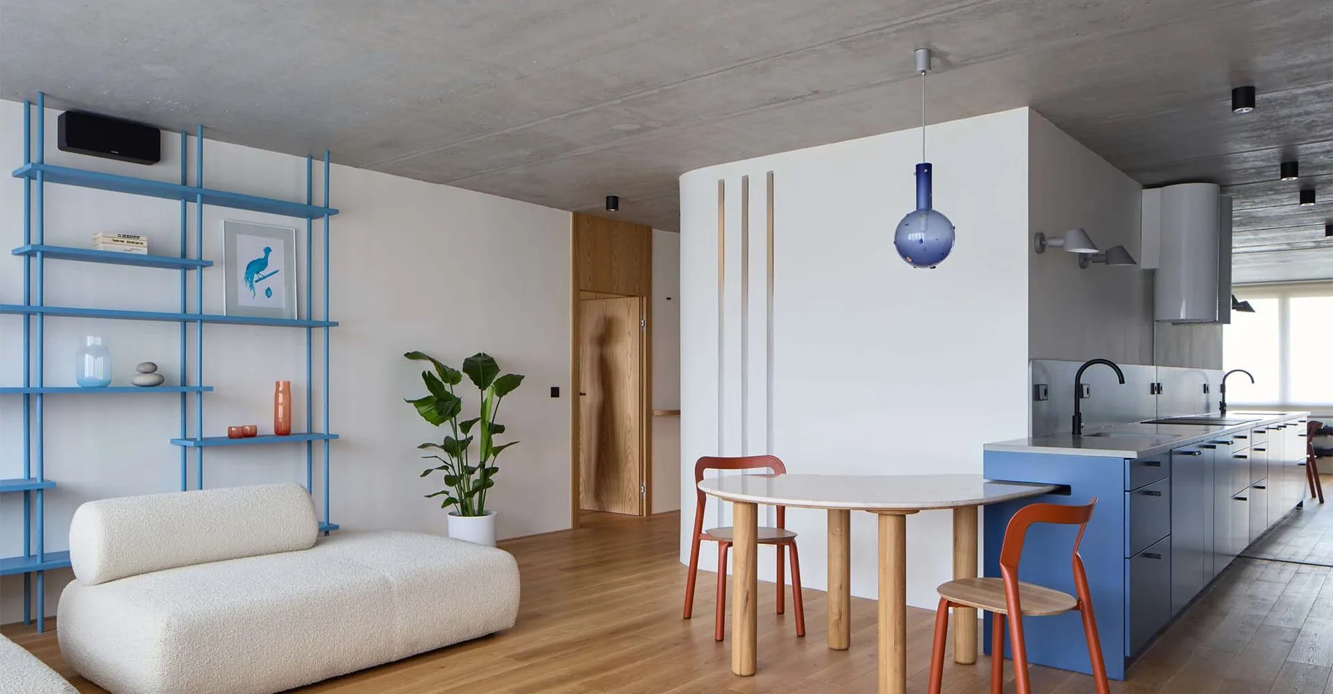 Tonos de azul se hacen presentes en la cocina, la biblioteca y la iluminación; cada uno ligeramente diferente, pero fluyendo entre sí como el mar que nos rodea. En el dormitorio, el estuco de arcilla evoca el fondo marino o una playa hacia la que navegamos.