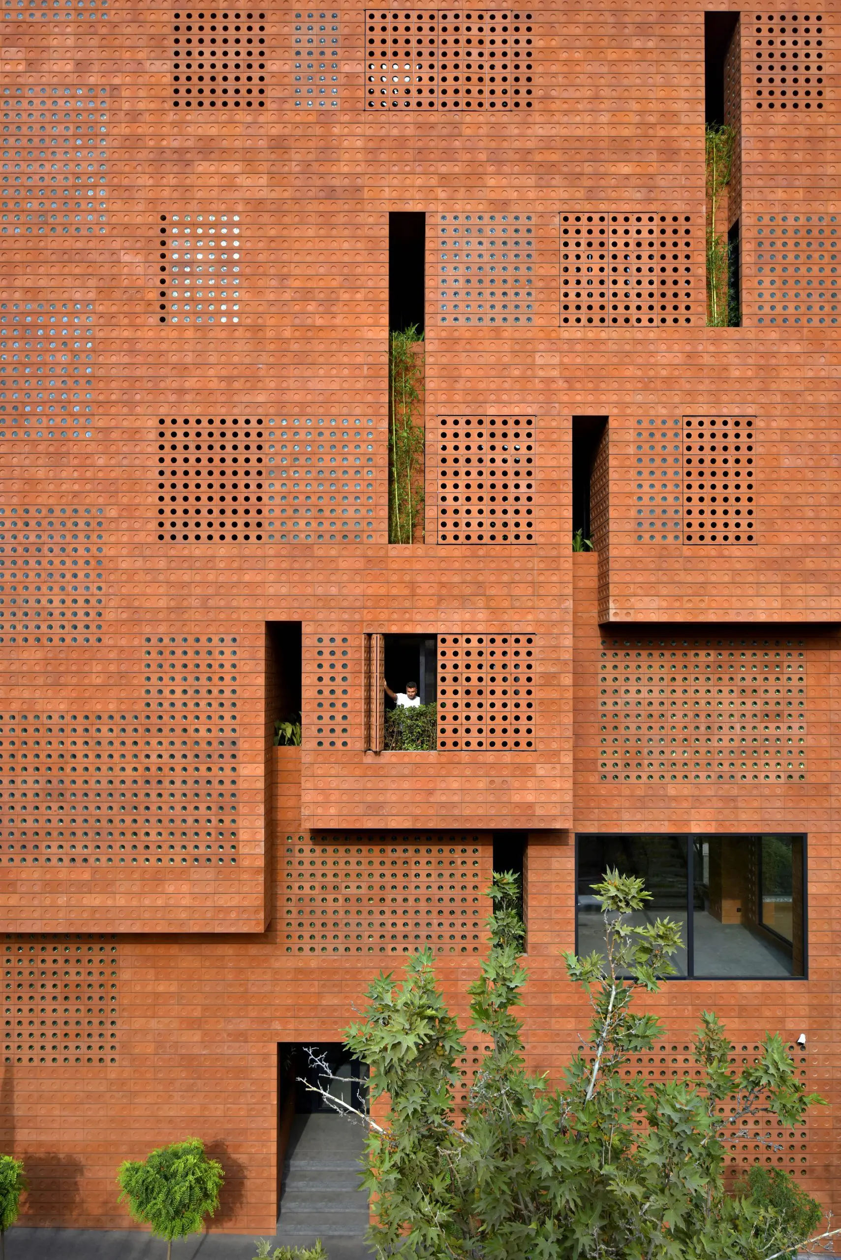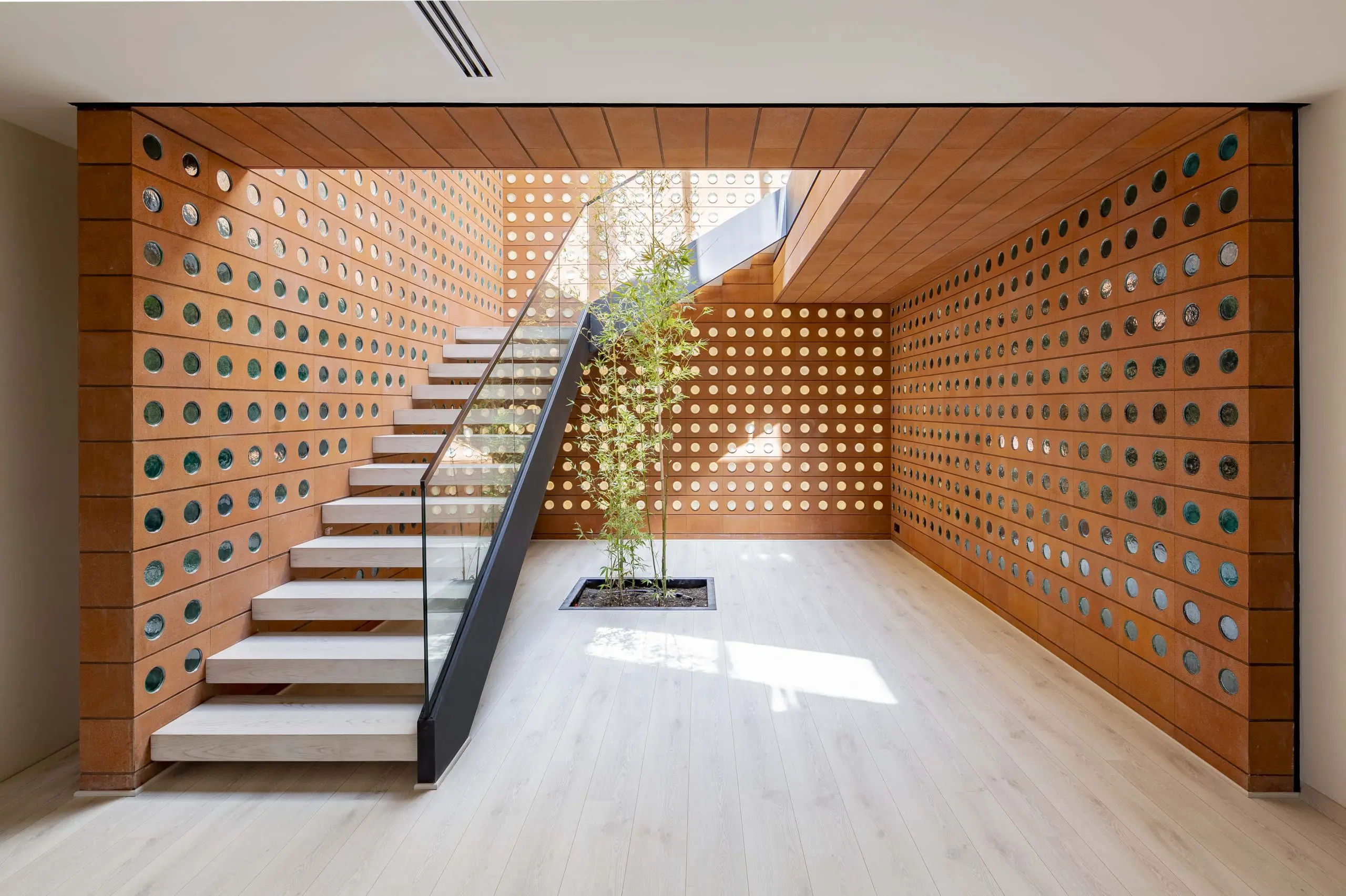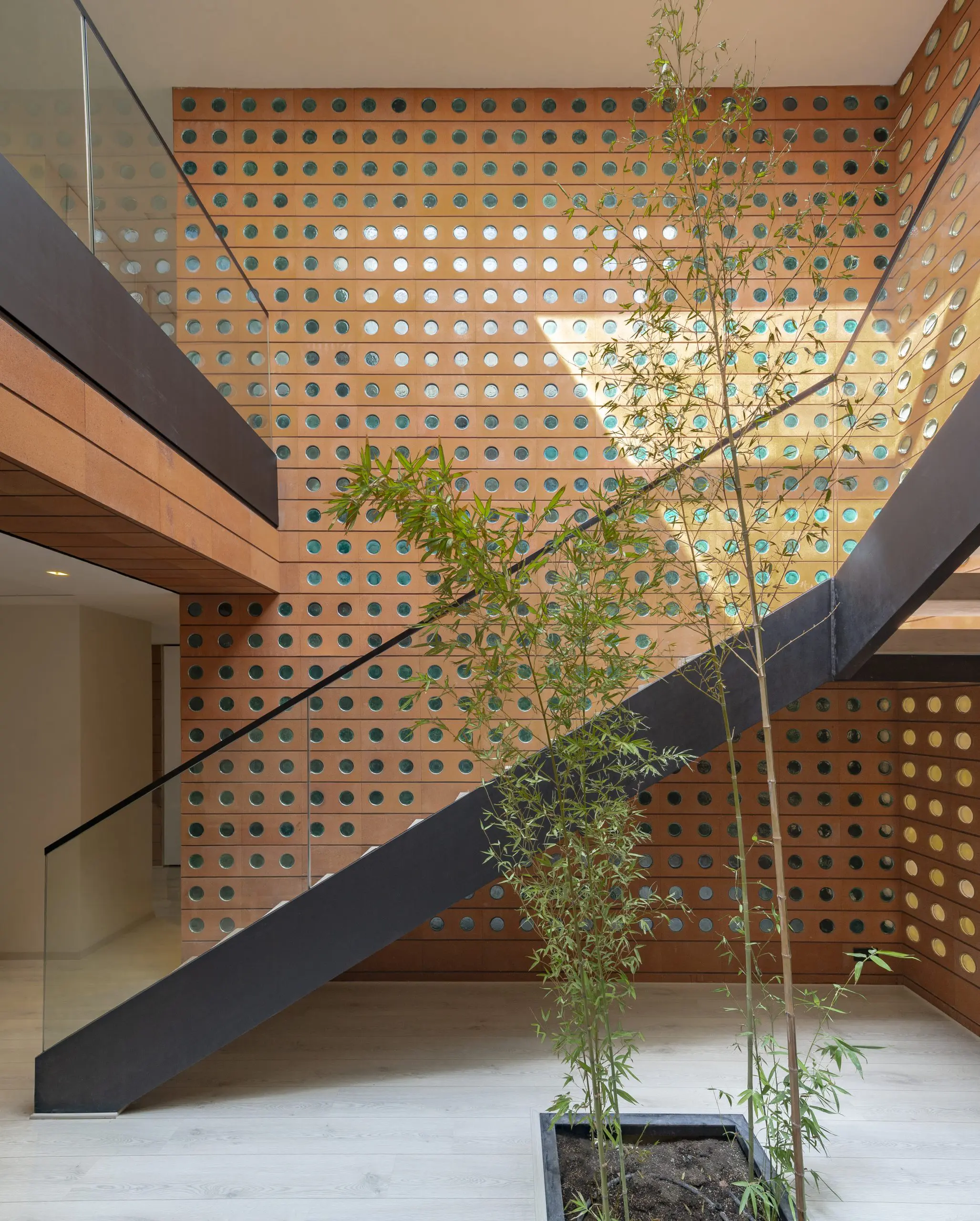 Los arquitectos también utilizaron esta nueva pieza de mampostería en un sistema de ventanas plegables, que al cerrarse se mimetizan completamente con la fachada y confieren al volumen la ilusión de solidez. Una variación del bloque, esta vez sin el vidrio en la perforación, permite la ventilación del espacio interior. En este proyecto, Hooba Design Group soluciona las variables constructivas, espaciales, de iluminación y ventilación con un solo material, una sola estrategia arquitectónica y una sola apuesta estética.