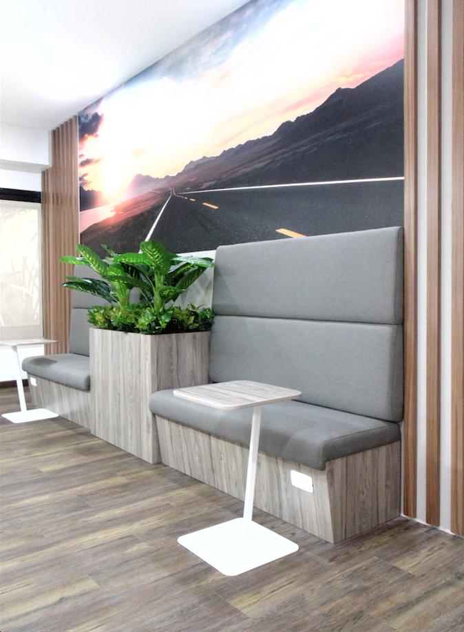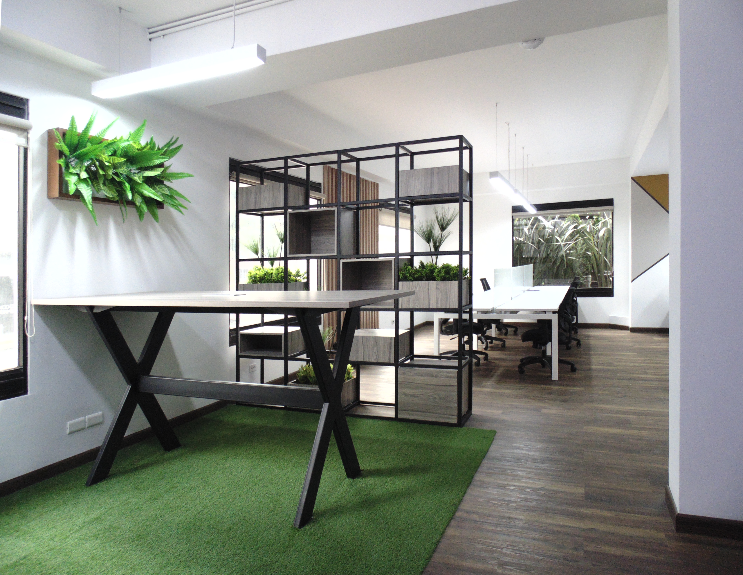 El segundo tipo son salas de reuniones cerradas dotadas de sofás, puffs pera y mesas auxiliares de trabajo, un mobiliario que resulta en un diseño más tranquilo y sobrio. Y el tercer tipo, es un espacio completamente abierto delimitado por estructuras metálicas, con módulos de madera para la aplicación de puntos verdes. Estos se adecuaron con la combinación de grama y piso vinílico, sofás modulares y mesas altas, ambos con elementos de conectividad. Un diseño de espacio ideal para una interacción informal.
