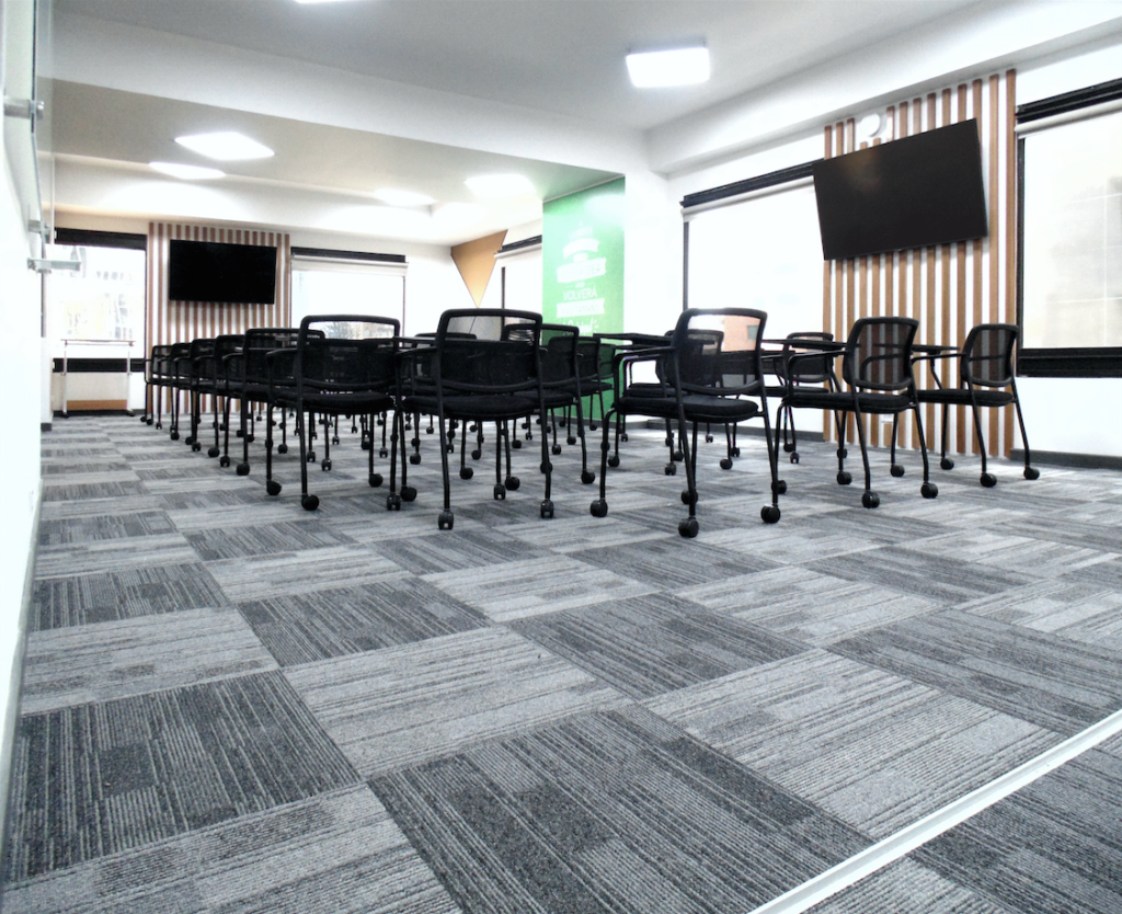 Por otro lado, para la sala de capacitaciones, se propuso una gran aula dotada de sillas universitarias y pantallas de gran formato con excelente visibilidad desde cualquier punto del salón. Adicionalmente, Tugó Proyectos brindó una solución para optimizar el espacio al instalar una puerta plegable que divide el espacio en dos aulas con la posibilidad de uso paralelo.