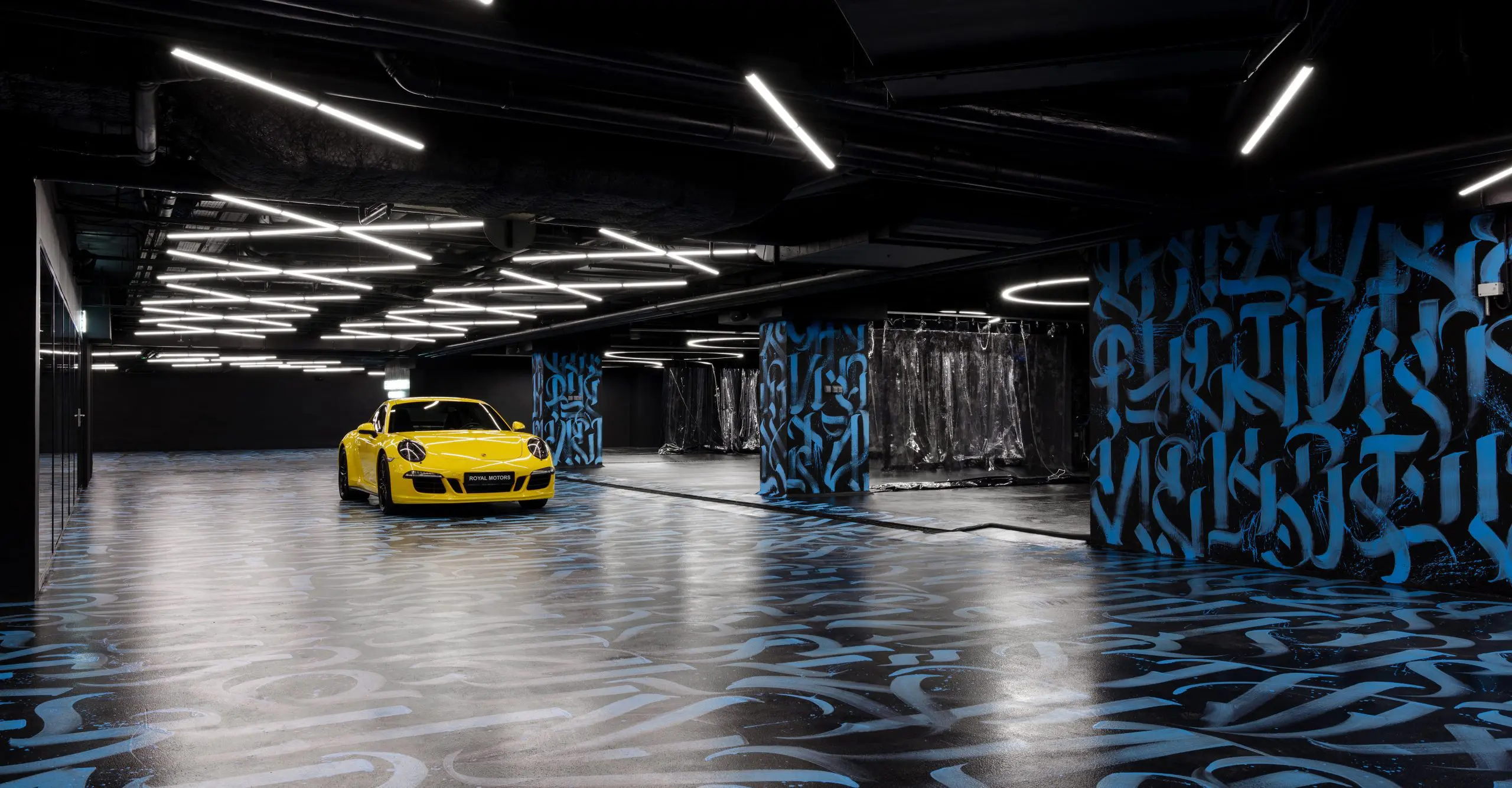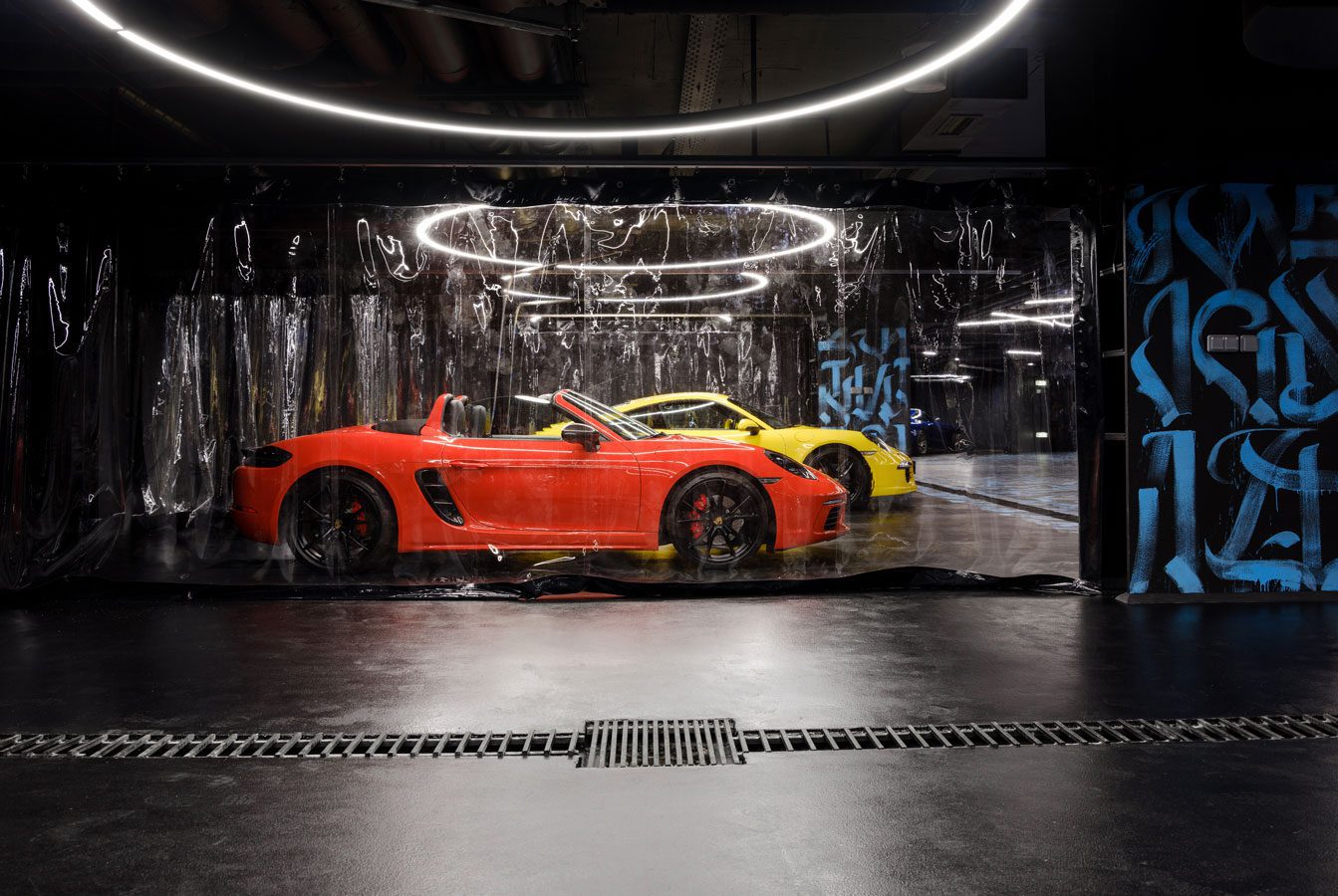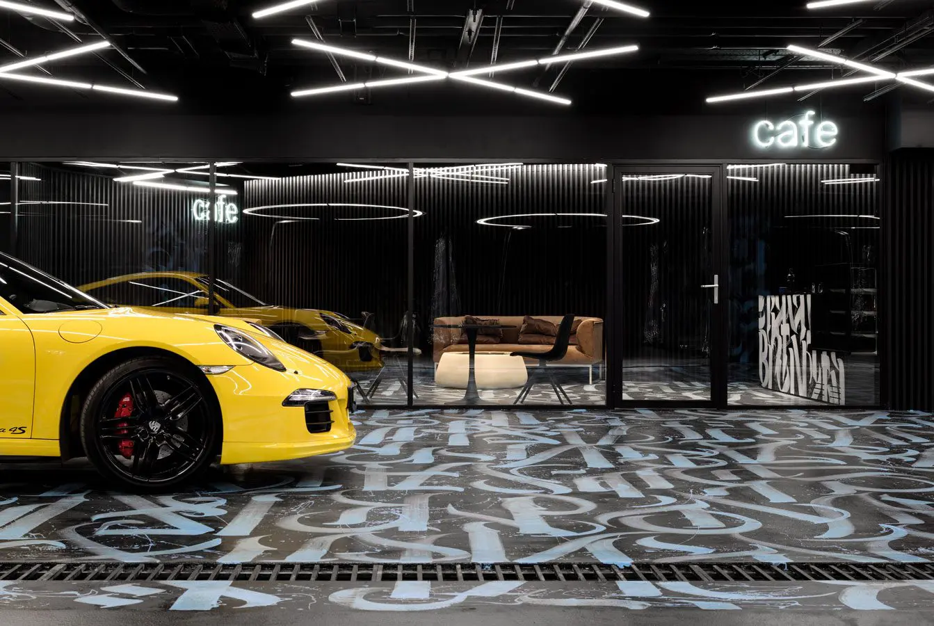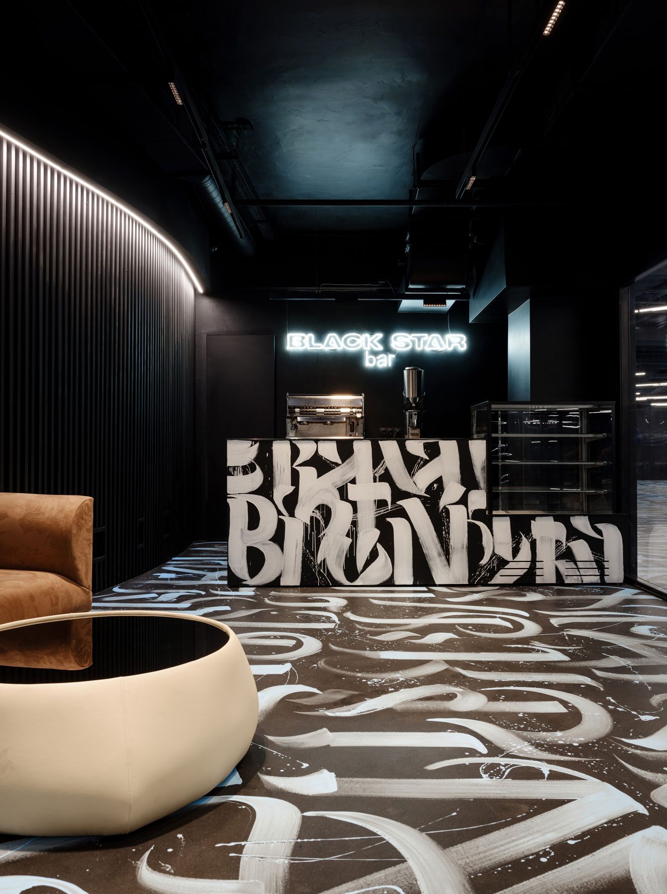 Teniendo en cuenta la función de instalación carwash e inspirado por Wynwood en Miami, Gretaproject creó un patrón de caligrafía especial que consiste en el nombre de la etiqueta del cliente que se repite regularmente Black Star. El patrón geométrico y gráfico crean una configuración memorable y una sensación de expansión dentro de un espacio cerrado.