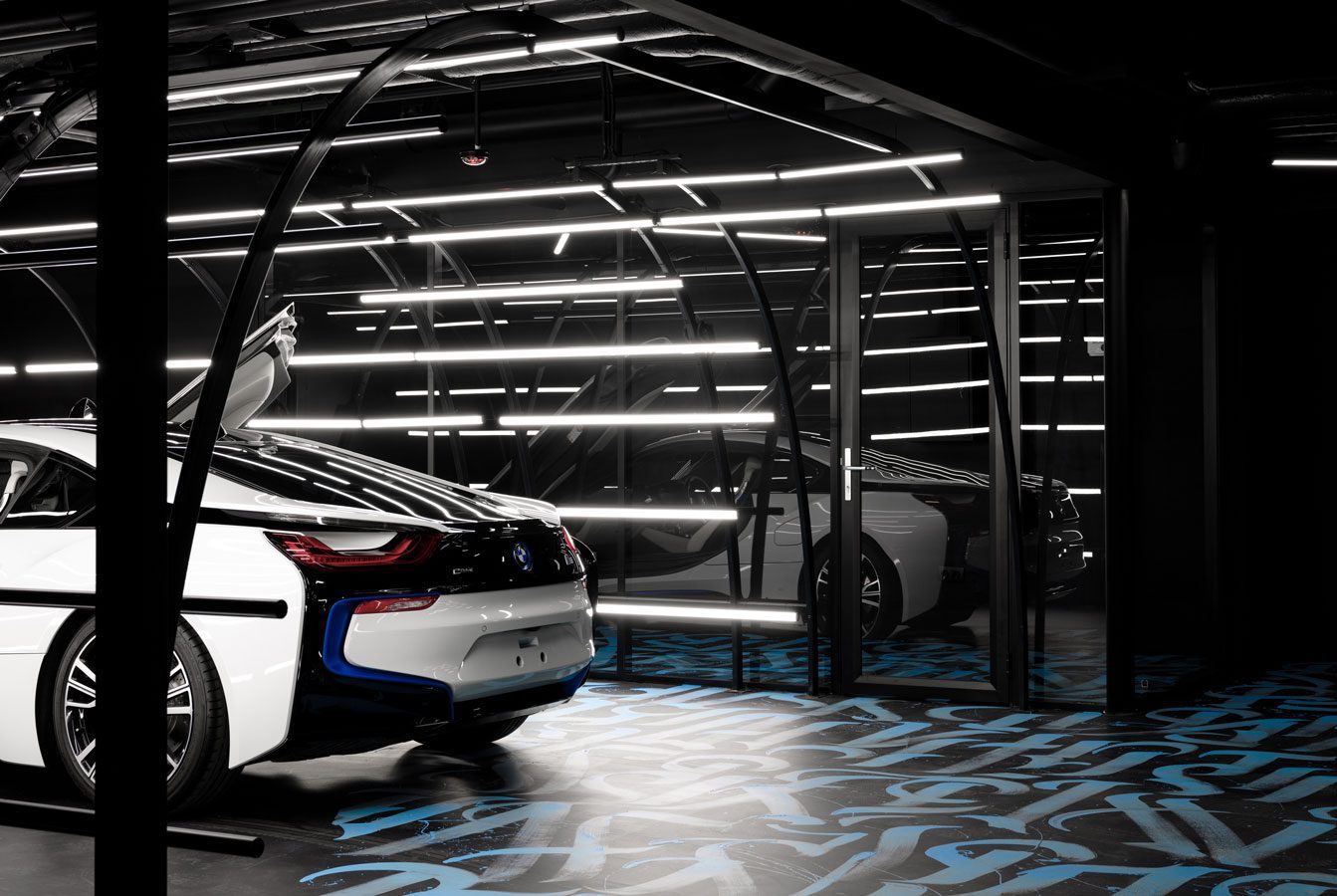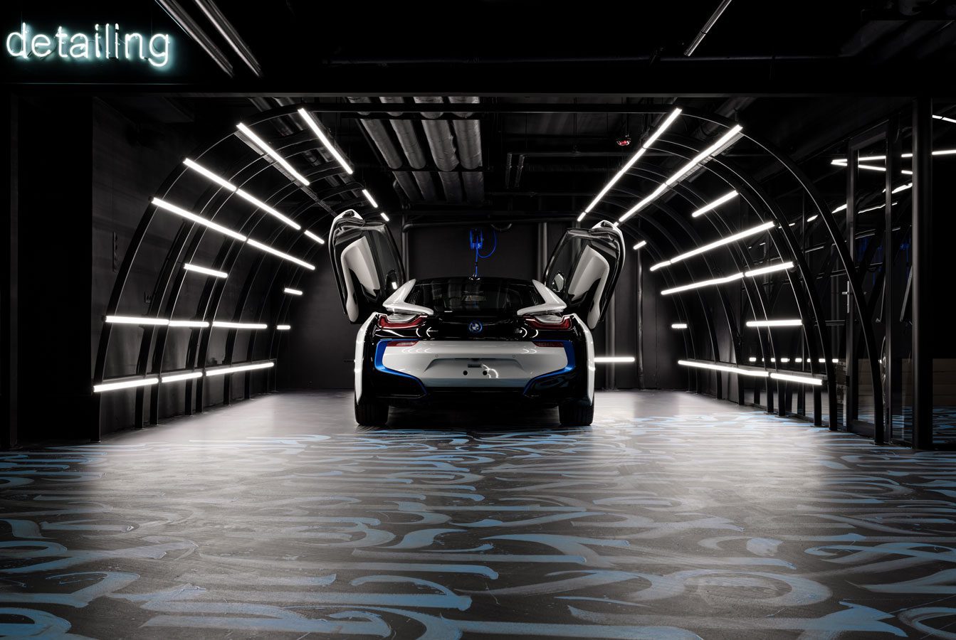 El símbolo de la etiqueta Black Star es el sol negro que se usó para crear la estructura de iluminación en forma de anillo en las cajas de lavado. En cuanto a la zona de entrada, la iluminación en forma de X se instaló para formar un contraste de los símbolos.