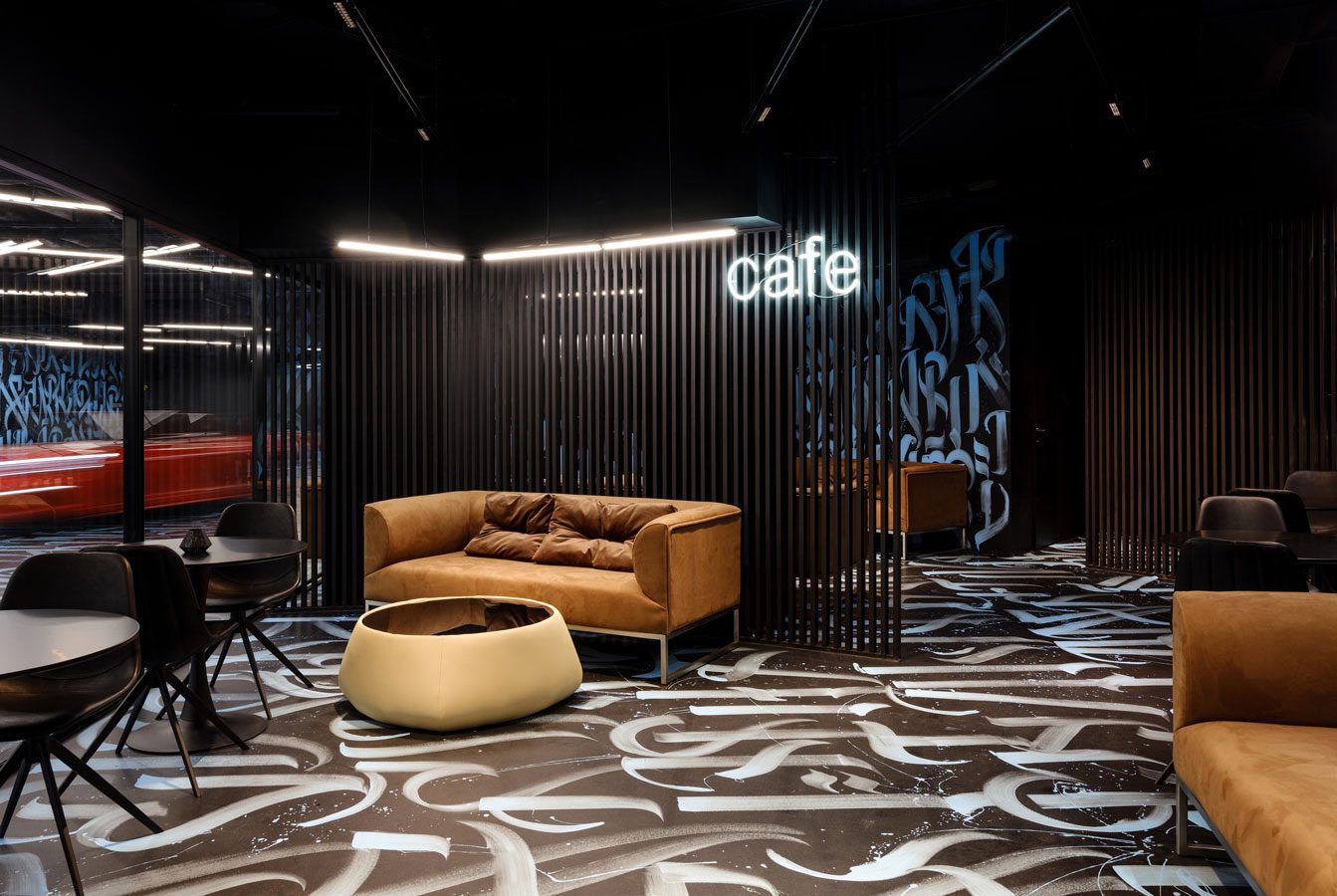 El concepto del interior es una transformación y refracción de la geometría simple del espacio por la forma. La idea se realiza mediante la combinación del color de grafito oscuro, la composición de caligrafía brillante y las instalaciones de luz.
