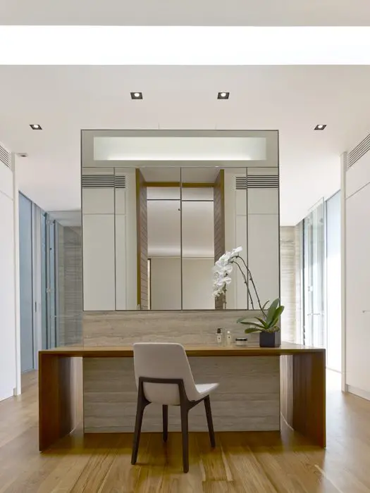 El intermedio cuenta con tres alcobas con baños propios y un área de uso comunal. Y, finalmente, el principal, posicionado en la zona más alta del lote de 1.500 metros cuadrados, está atravesado en el piso inferior por un espejo de agua con una isla flotante que sirve como sala de estar con vista directa a la piscina y los jardines circundantes. En la planta superior se encuentra la suite, que consta de una sala privada y la habitación con su baño y walk in closet, todo con una panorámica privilegiada.