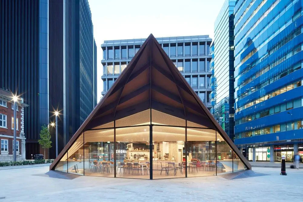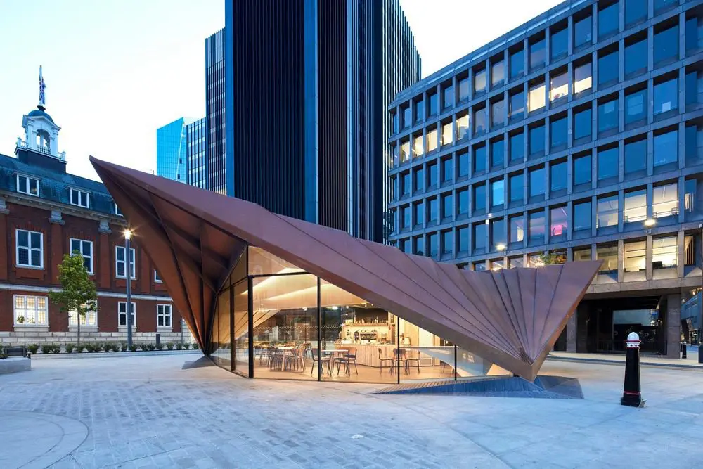 El pabellón, que será administrado por la empresa social local Kahaila como cafetería y espacio comunitario multifuncional, se sienta con orgullo en este nuevo paisaje, ofreciendo un servicio público y mejorando la conexión entre los dos edificios patrimoniales distintivos que se encuentran a ambos lados de la nueva plaza: la iglesia de St Botolph sin Aldgate y la escuela primaria Foundation de Sir John Cass. Es el segundo de una serie de pabellones planificados por la City of London Corporation y se requirió una relación estética con el primer pabellón ganador del premio RIBA, el Centro de información de la ciudad de Londres adyacente a la Catedral de San Pablo, que se completó en 2008.