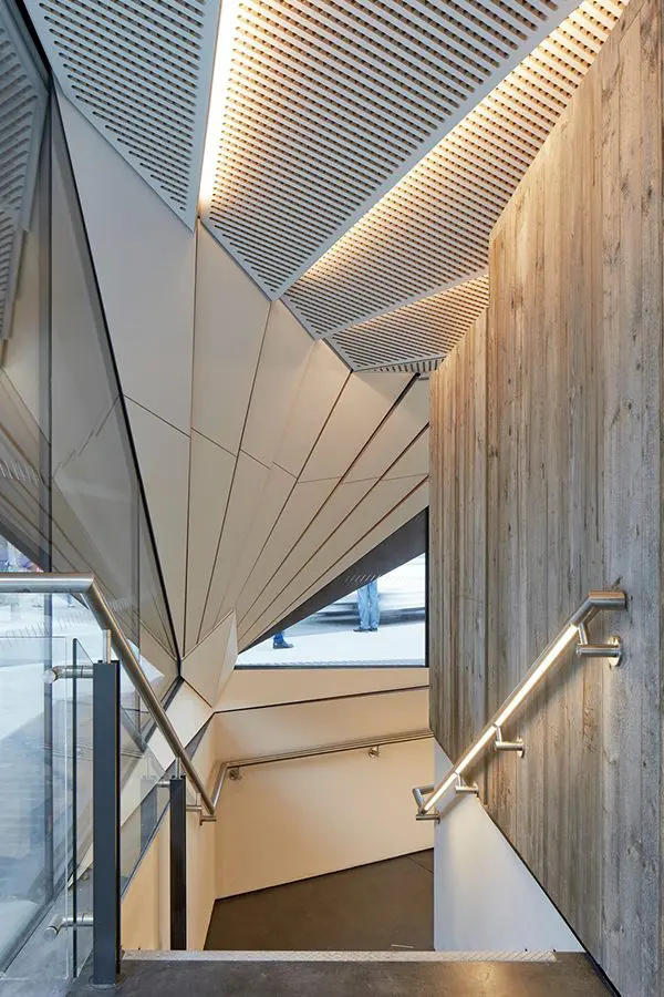 Diseñado paramétricamente, la forma del pabellón ha sido cuidadosamente pensada con respecto a los accesos peatonales clave a la nueva plaza. Como tal, no tiene parte trasera, y sus tres elevaciones acristaladas miran a Duke’s Place al noroeste, Houndsditch y St Botolph Street al noreste, y la nueva plaza y Aldgate High Street al sur. Estas elevaciones proporcionan vistas claras hacia y a través de la estructura y brindan vigilancia natural, así como las entradas al pabellón en todos los lados.