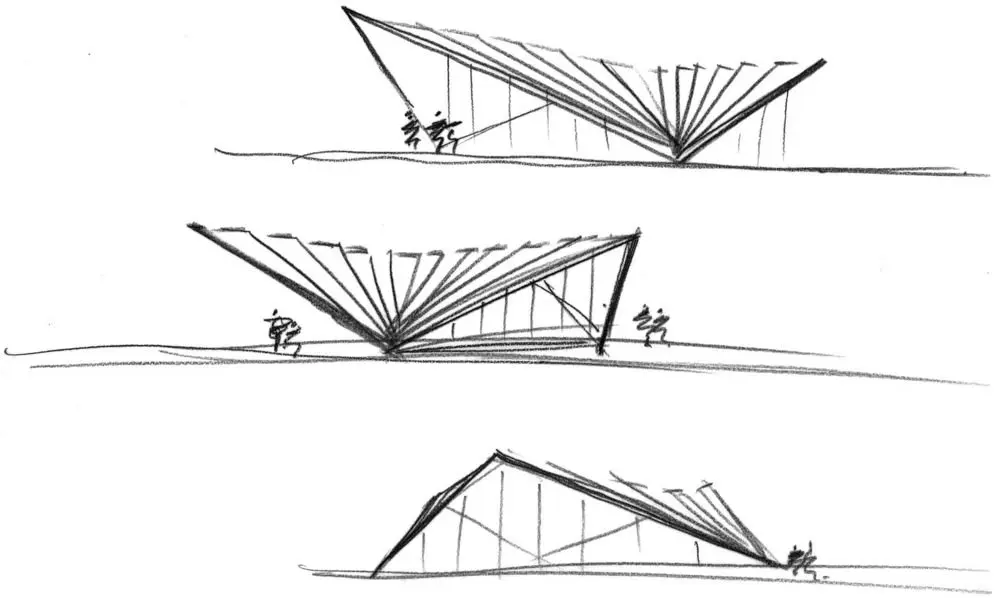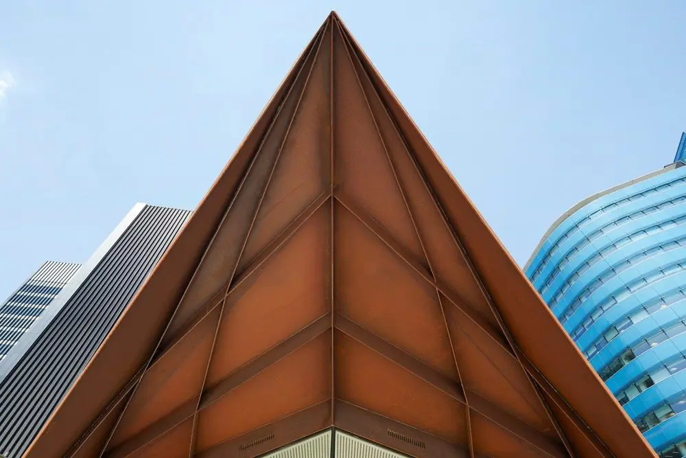El pabellón retoma los ángulos asimétricos del Centro de información de la ciudad de Londres con una estructura angular que se pliega para encontrarse con el suelo en solo tres puntos de soporte triangulares, con acristalamiento en el medio. Los paneles de revestimiento forman una piel estructural rígida que cubre el pabellón y crean una superficie facetada que reduce el perfil general del pabellón y proporciona su carácter. Los canales creados por el revestimiento en capas también son funcionales, lo que permite que el agua de lluvia corra por ellos hacia los discretos drenajes ubicados donde el acero se junta con el pavimento Yorkstone. Los tonos cálidos de la campana de acero desgastada con el ladrillo marrón de la iglesia clasificada como Grado I y la escuela primaria listada en Grado II de ladrillo rojo. Con el tiempo, el acero se oscurecerá y proporcionará un contrapunto terrenal y complementario.