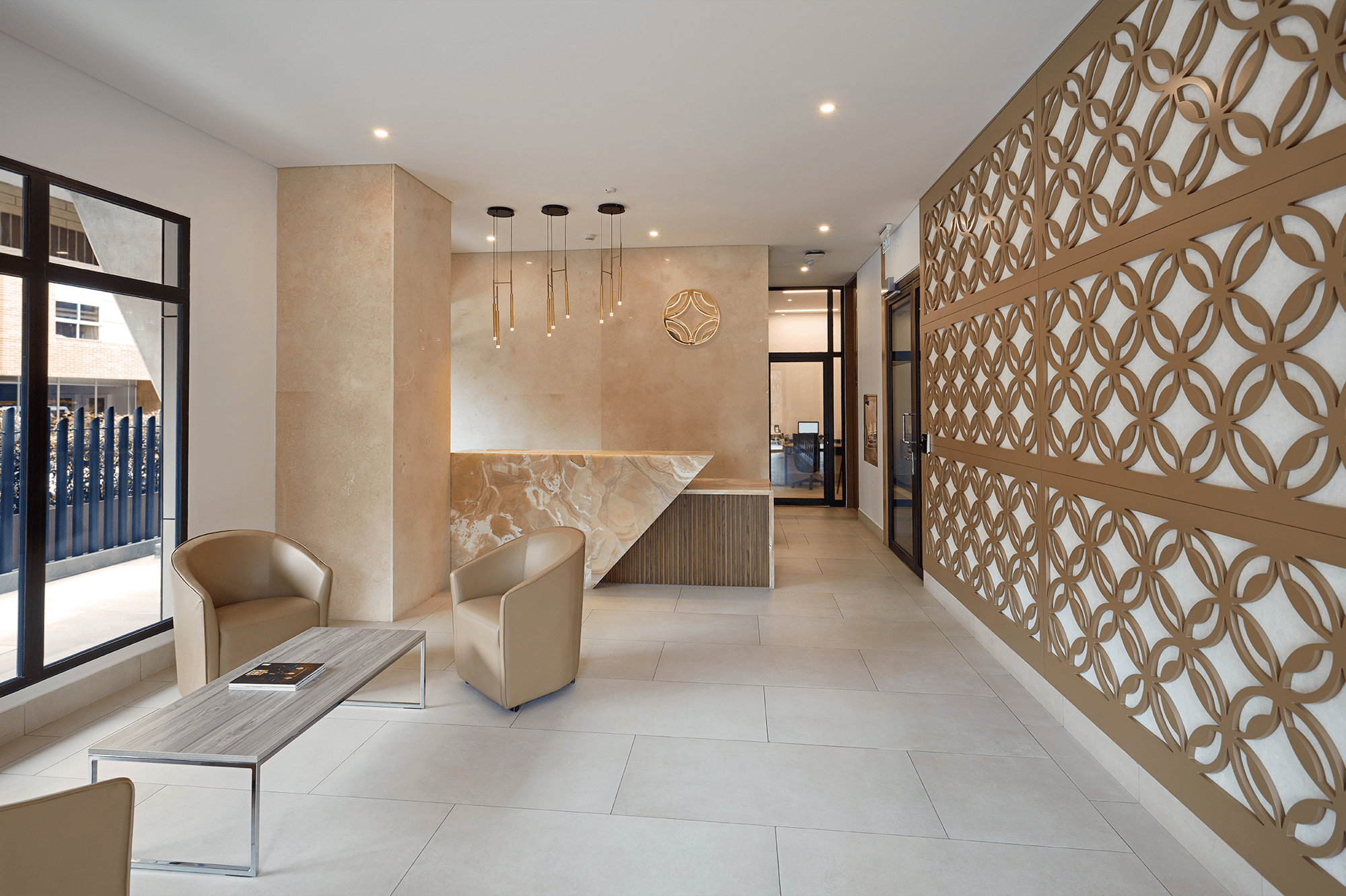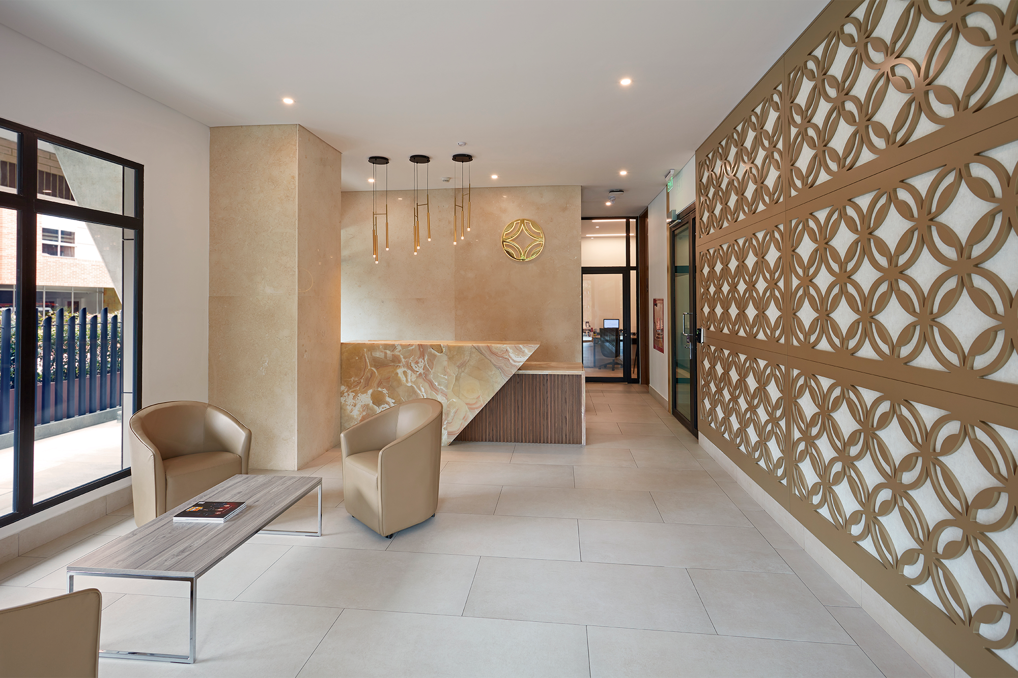 Los materiales pétreos predominan junto con geometrías oblicuas y ángulos agudos. En cuanto al color, los arena, beige y blanco contribuyen a crear un espacio diáfano y sobrio; los acentos provienen del entramado de flores bronce que reviste uno de los muros laterales, así como del tapizado de los muebles, que conserva la paleta de tonos tierra, pero con un ligero brillo, afín al lenguaje visual de la compañía.