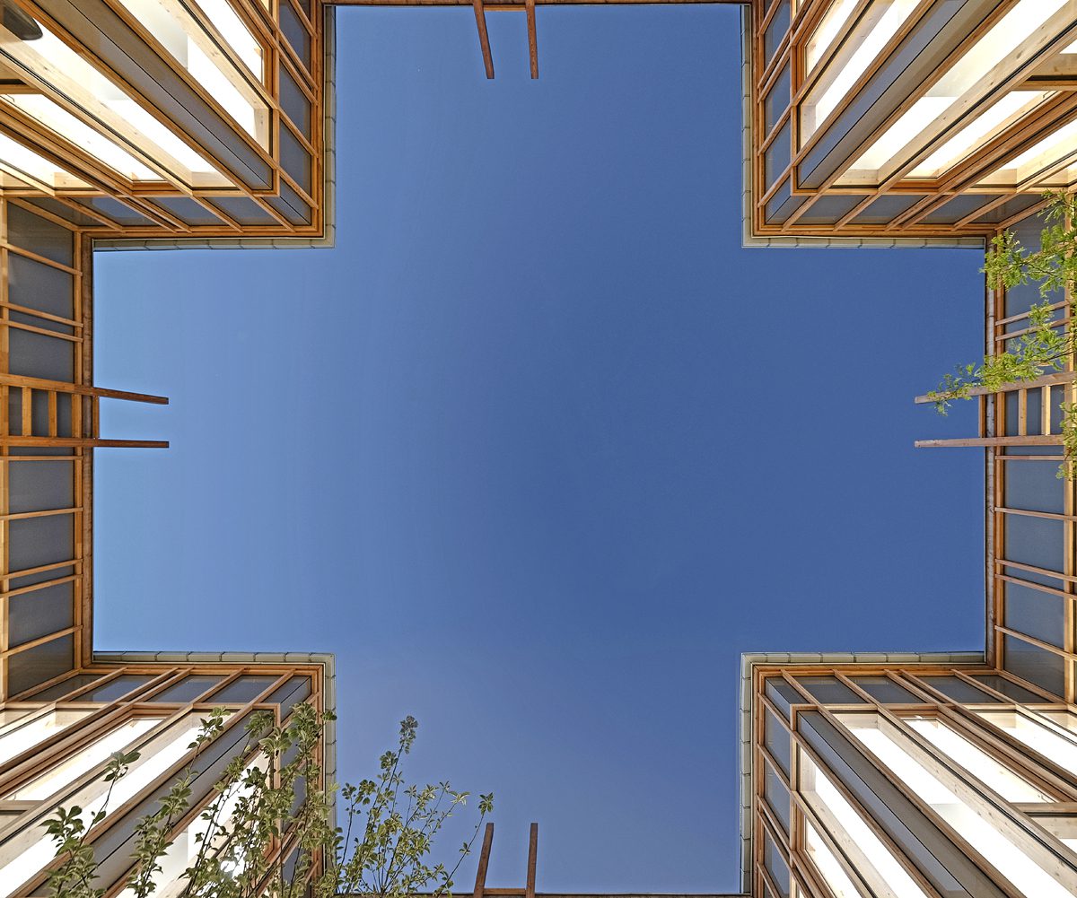 Si bien los muros que delimitan el patio los construyeron con grandes paneles de vidrio, la fachada exterior del proyecto tiene una expresión opuesta. La estructura de madera a la vista y los cerramientos de tablilla muestran una modulación rigurosa en la que aparecen pocas ventanas –el acceso solo se da por medio de vidrieras–. El resultado es un volumen estratégicamente perforado, en el que las aberturas producen un cascarón sólido de madera, que limita la relación del interior con el entorno para abrirse por completo hacia el centro.
