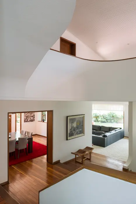 En oposición a lo compacto de la planta compartimentada, mediante la utilización de muros curvos y sinuosos, de cambios de nivel, de aperturas y de vanos, el arquitecto logra concebir una única área compuesta por un conjunto de habitaciones (comedor, salas sociales, estudio) que estimulan la vida en familia por medio de interiores que promueven circulaciones entre los mismos.
