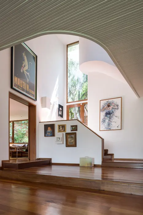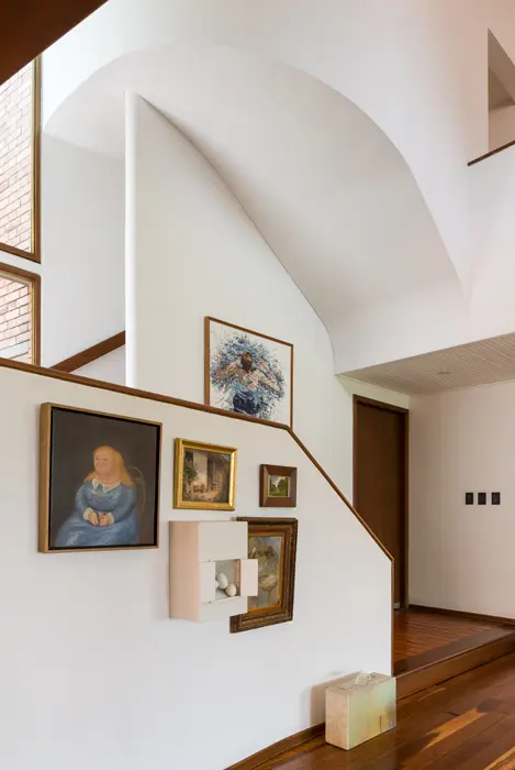 Al subir está el punto central de la composición y la previa percepción del recinto cambia, pasa de un espacio encerrado a uno de doble altura con límites difusos que permite contemplar todos los ambientes que forman la casa, en particular los abiertos y colectivos.