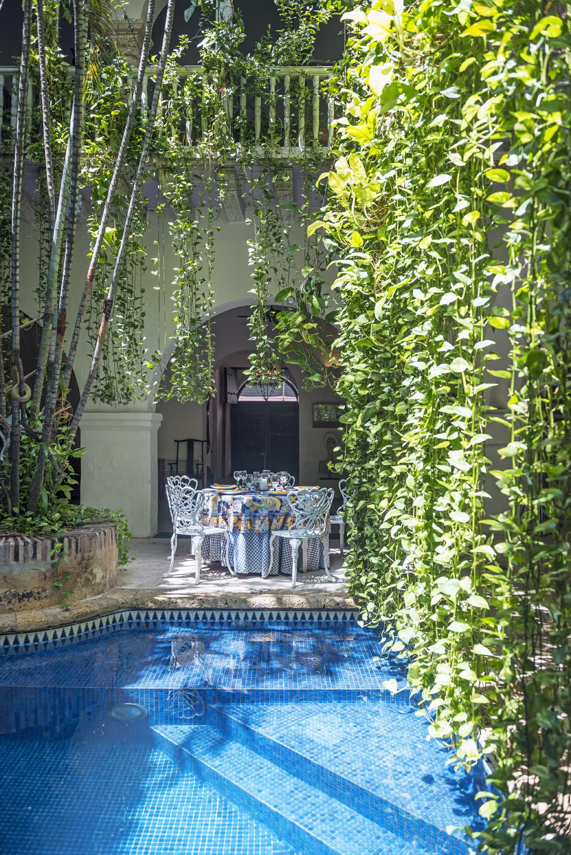 Después de los trabajos de renovación, la casa presenta una propuesta en la que los espacios exteriores son protagonistas, como se ve en este comedor en medio de arcos, donde una pared vegetal que llega al segundo nivel rompe las barreras entre adentro y afuera. Las enredaderas que cuelgan de balcones, y las palmas, son el toque final para este ambiente que invita a relajarse y disfrutar del sol.