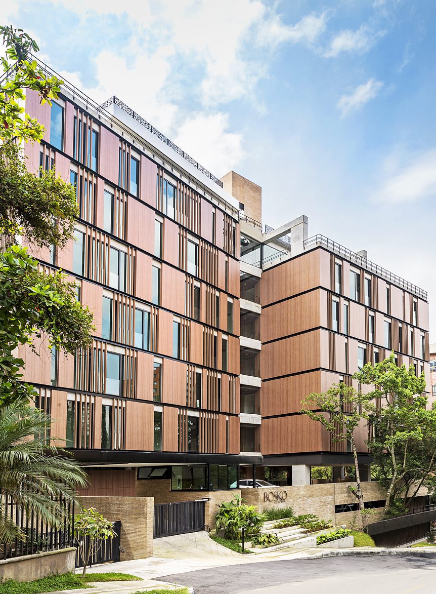 Construido por Conexo Inmobiliario y con diseño de Juan Forero Arquitectos, este edificio en Medellín tiene una fachada que otorga privacidad por medio de aperturas controladas hechas con Panelex, en referencia Serra Dorato 1835, proveídas por la compañía Lamitech.