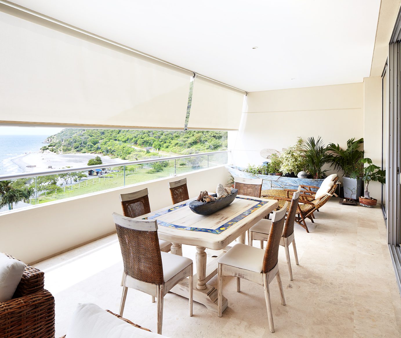 Para manejar la entrada de los rayos de sol, que puede ser inclemente en ciertas horas del día, optaron por un toldo vertical de la multinacional Hunter Douglas, que contribuye al control térmico del espacio sin afectar el interiorismo, pues su color comparte la misma línea cromática del diseño en general.