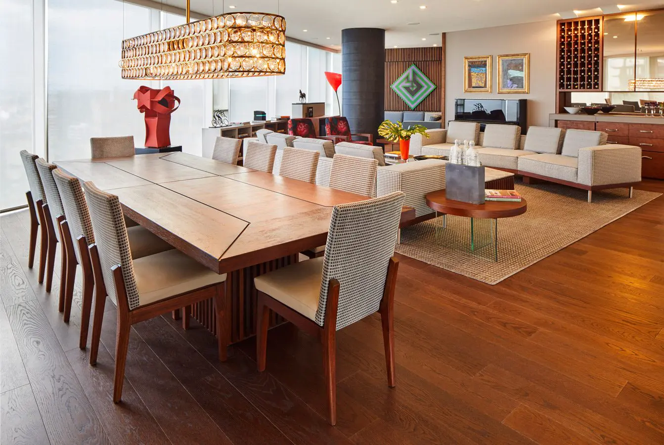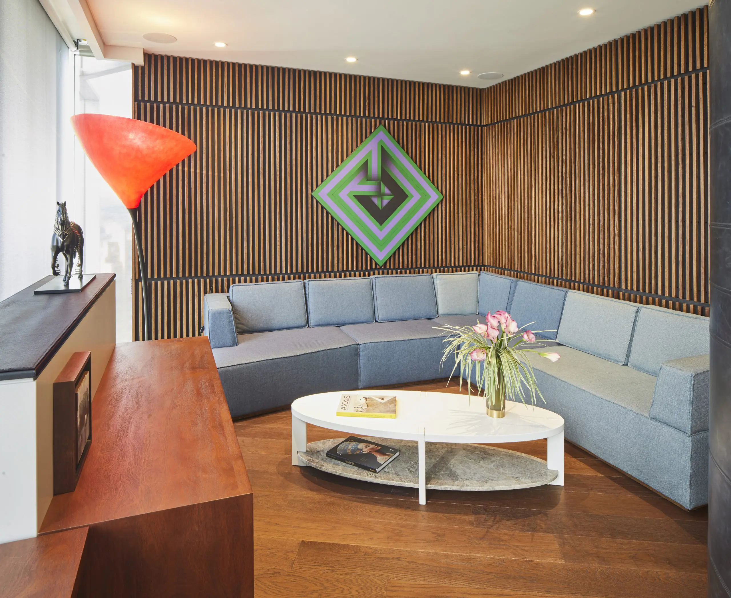 Las distintas funciones en el área social se segregan con sutileza a partir de la disposición de los muebles y aprovechando la presencia de la columna circular, que otorga algo de privacidad a la zona de estar. El mobiliario lo componen piezas largas y horizontales, algunas de ellas anguladas para proveer de diversidad geométrica a los recintos generados. Sus proporciones horizontales resaltan la generosidad espacial del apartamento, mientras crean estancias independientes, sin interrumpir su fluidez.