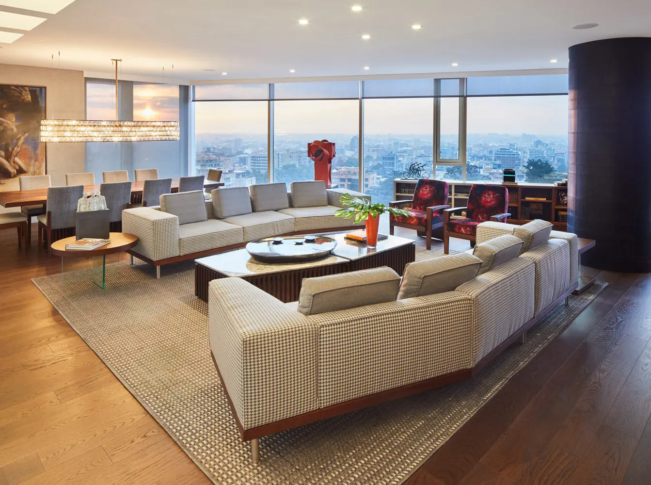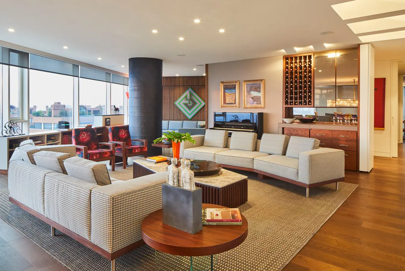 El piso está dispuesto como una superficie ininterrumpida de madera cálida, cuyas intensas vetas y leves cambios de tono se extienden por prácticamente todos los espacios, desde los interiores hasta las terrazas, lo cual le otorga unidad a la materialidad de la vivienda. Los muros y el mobiliario dialogan con este telón de fondo a partir de una paleta restringida, donde el blanco, los grises cálidos y las variaciones del taupé se suman a la madera, utilizada de manera continua o a partir de texturas alistonadas para generar un ambiente acogedor, que contrasta con la simplicidad y austeridad del blanco que define al edificio.Uno de los metros cuadrados más caros de bogotá
