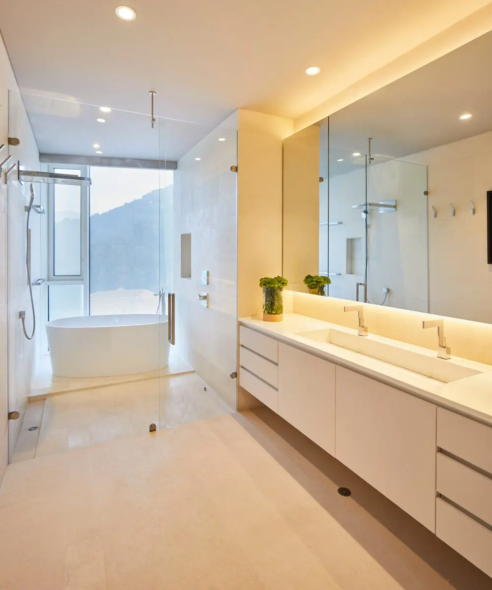 La habitación principal utiliza una estrategia similar a la de los espacios sociales, a partir de muebles de carácter bajo y horizontal, que conforman recintos de usos diversos dentro de un mismo ambiente, para garantizar el acceso constante de la luz natural y el disfrute ininterrumpido de la espectacular vista. Su baño está definido a partir de una paleta prácticamente monocromática, donde el piso, el mobiliario, el mesón y los aparatos sanitarios exhiben un blanco continuo, el cual refleja y exalta la gran cantidad de luz que entra y lo hace sentir amplio y agradable.Uno de los metros cuadrados más caros de bogotá