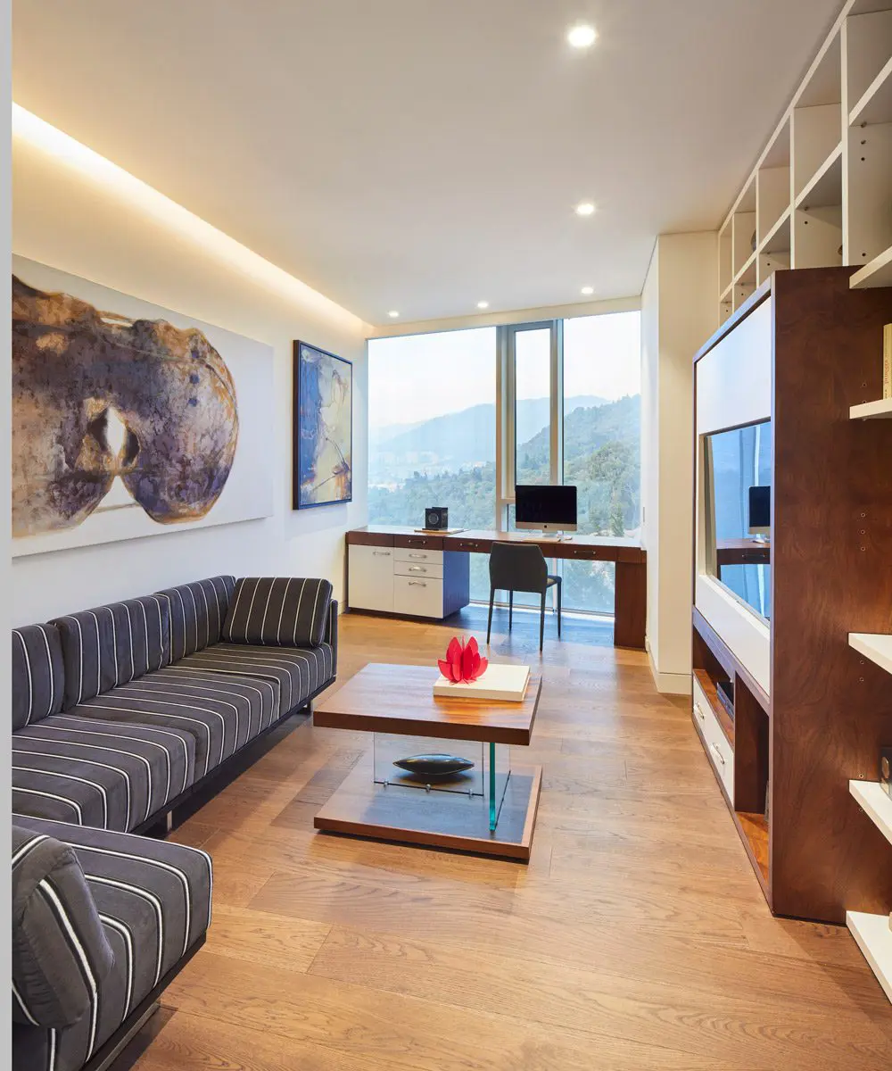 De esta manera, el diseño ascético y prístino que Richard Meier planteó para el exterior es contrastado con la calidez y riqueza de las texturas. El interiorismo propuesto por Lian logra acoplar dos mundos en apariencia opuestos para concebir una combinación armoniosa, agradable y acogedora, que maximiza las virtudes espaciales, la luminosidad y las visuales planteadas por la propuesta original.