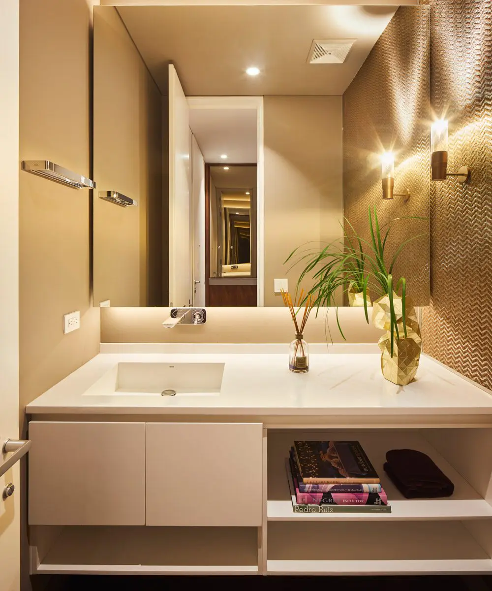 A partir de esta paleta de materiales, restringida, cálida y homogénea, el diseño del arquitecto Gabriel Lian presenta un ambiente amable y acogedor, con algunos toques de color generados por piezas singulares que resaltan sobre este trasfondo: obras de arte, cojines y elementos decorativos que sobresalen por su forma o su tono.