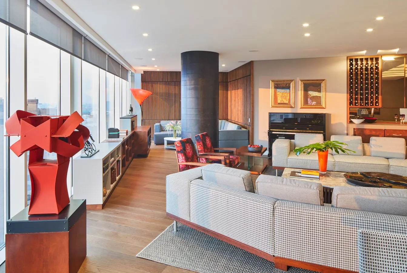 El área social, compuesta por la cocina, el comedor, el salón y una íntima zona de estar, se encuentra integrada. Este espacio, iluminado en la práctica de forma natural, está bañado de manera homogénea por la gran cantidad de luz que penetra por los ventanales perimetrales y por el lucernario dispuesto estratégicamente en la parte más profunda de la planta. La cocina, comunicada lateralmente con el comedor, presenta una superficie de trabajo en una barra larga que da a la terraza y disfruta de la vista sobre la ciudad.Uno de los metros cuadrados más caros de bogotá
