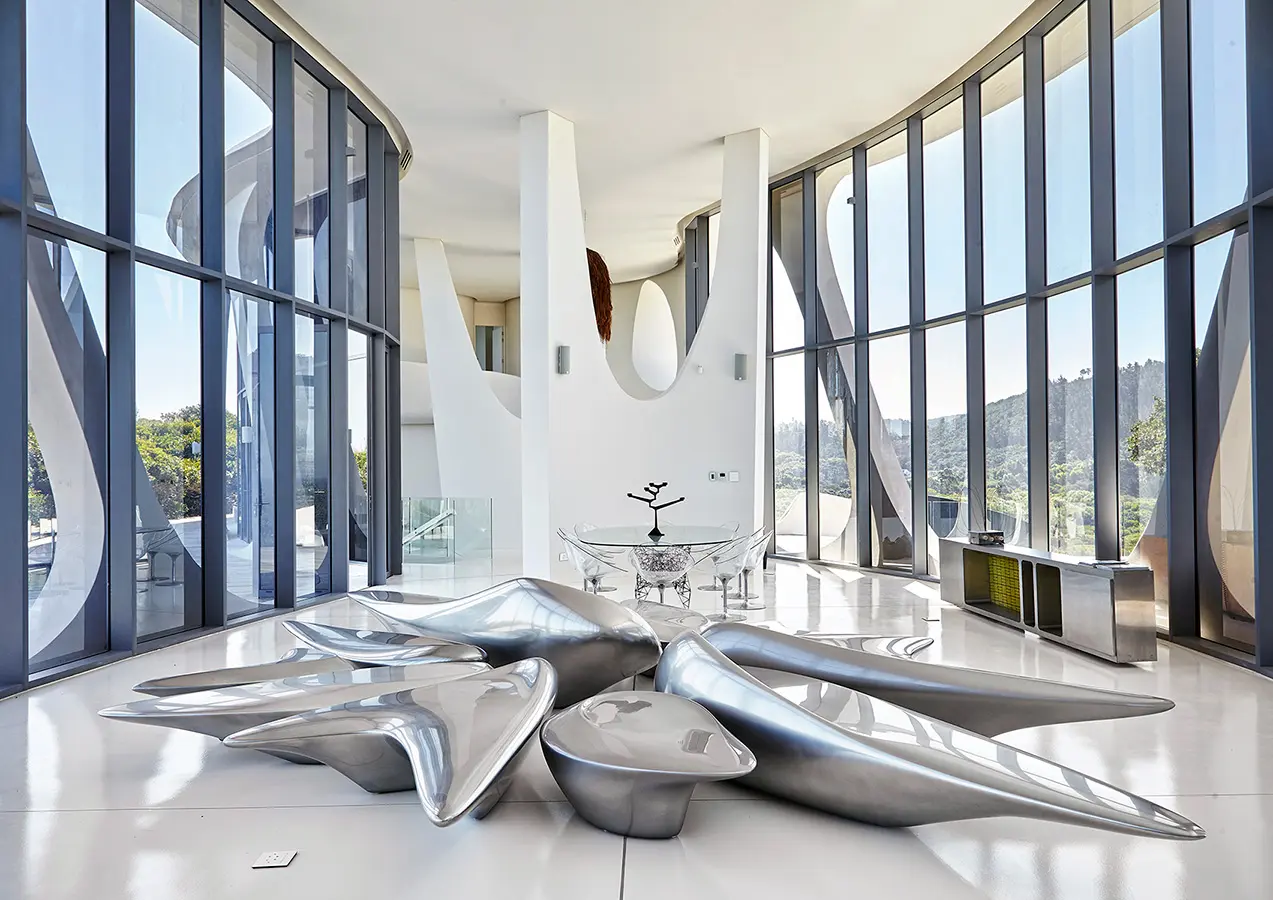 Y debido a su interés en la historia y el ADN de los diseños que lo apasionan, esta casa fue una exploración de las raíces y del desarrollo de la arquitectura orgánica. Treger, Rech y Carstens se encontraron explorando el arte futurista y la arquitectura de los años sesenta, como la Villa Mondadori en Cap Ferrat, Francia, del arquitecto brasileño Oscar Niemeyer; el TWA Flight Centre del aeropuerto JFK en Nueva York, diseñado por el arquitecto estadounidense de origen finlandés Eero Saarinen, o las casas californianas futuristas del arquitecto estadounidense John Lautner. Además, esta propiedad tiene más de un guiño a la reciente obra de Zaha Hadid. “Fue una carta de amor para los arquitectos de esa época”, dice Rech.