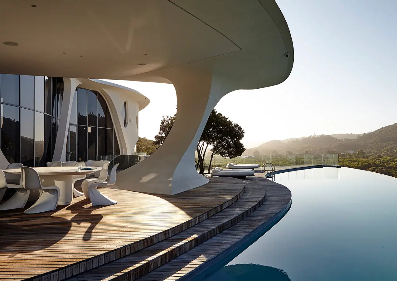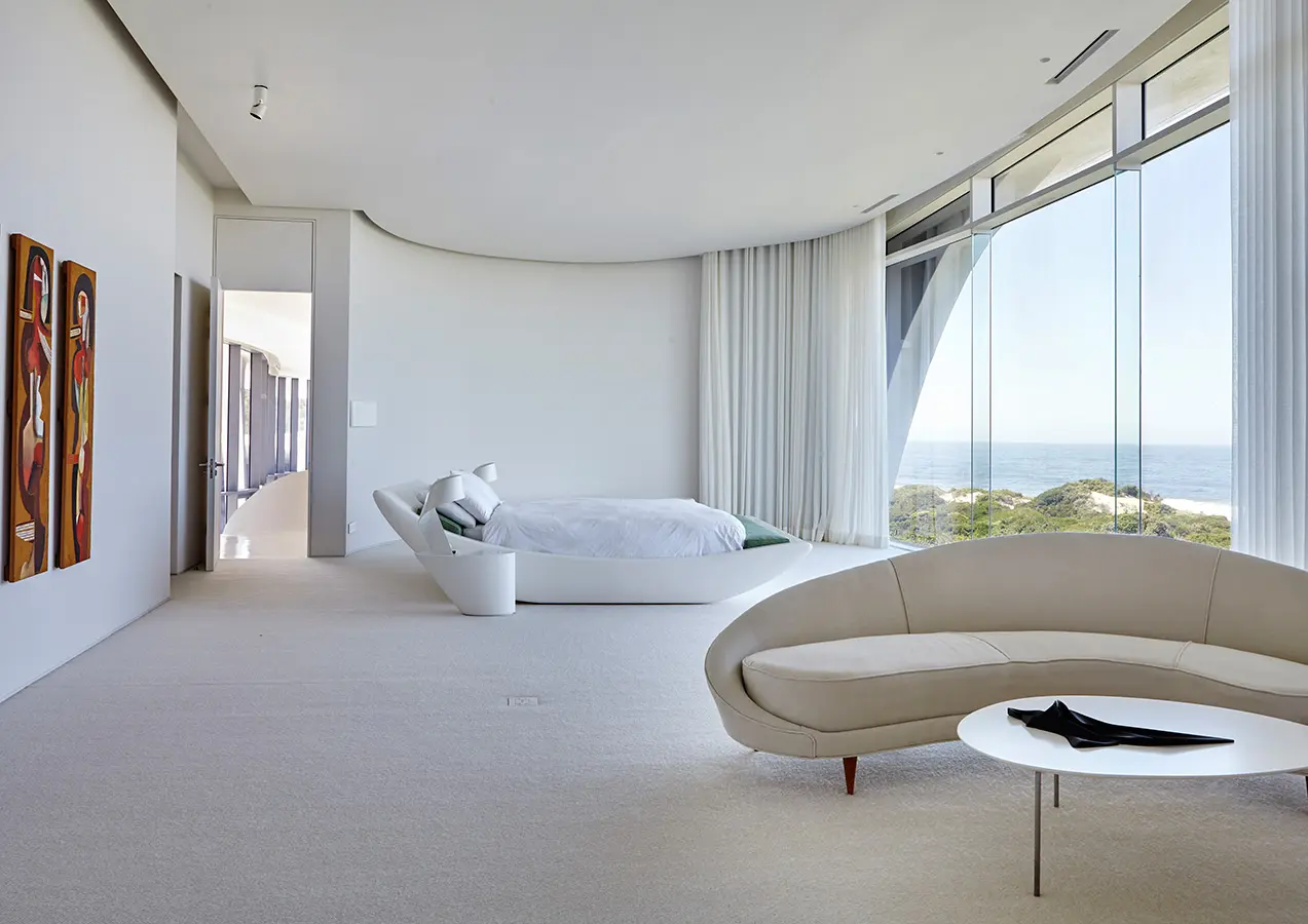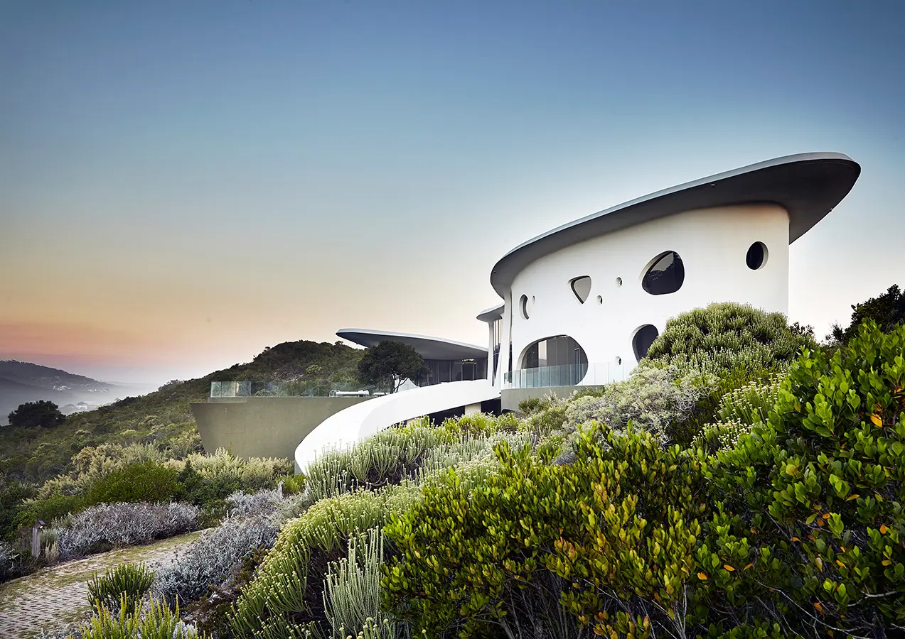El edificio podría considerarse una contradicción: a primera vista impacta, aunque su forma ondulada es discreta y sensible con su entorno. La llaman K. Cottage (Cabaña K) –a pesar de que con tres pisos de altura es sustancialmente más grande que una cabaña–, es la casa de vacaciones de Julian Treger, activista inversionista y gestor de fondos sudafricano radicado en el Reino Unido. El propietario es un prominente coleccionista de diseño y arte, y apasionado por la arquitectura. Dice que en un principio quería un espacio superminimalista, pero luego consideró más apropiada “la arquitectura orgánica dada la sinuosa naturaleza de las colinas, la montaña detrás y el movimiento del mar”.