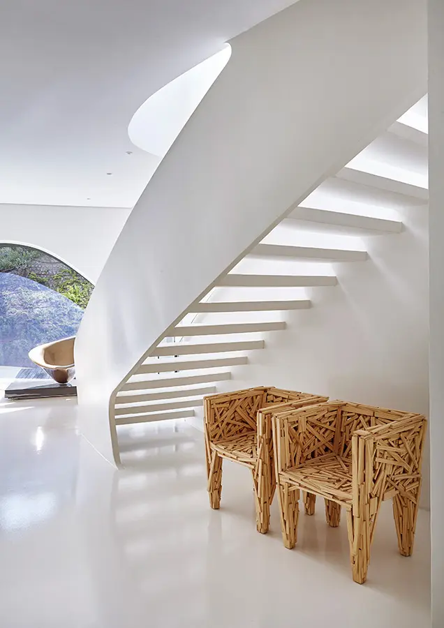 “A medida que recorres el edificio tienes vista hacia todas las direcciones. Ya sea a través de este muro/cortina que se contornea y se mueve alrededor, o de las aberturas ovaladas que han sido seleccionadas para que al llegar a la esquina haya una vista perfecta”, dice Rech. El otro objetivo de la casa es servir como galería para la colección de arte y mobiliario del propietario, quien ha elegido piezas que son apropiadas para esta propuesta y reflejan un poco el diseño orgánico, entablando un diálogo con la estructura. “La mayoría es mid-century modernism”, explica Julian Treger. Asimismo, ha escogido trabajos de los diseñadores brasileños Campana porque “sus materiales tienen una sensación orgánica, como de la playa”.