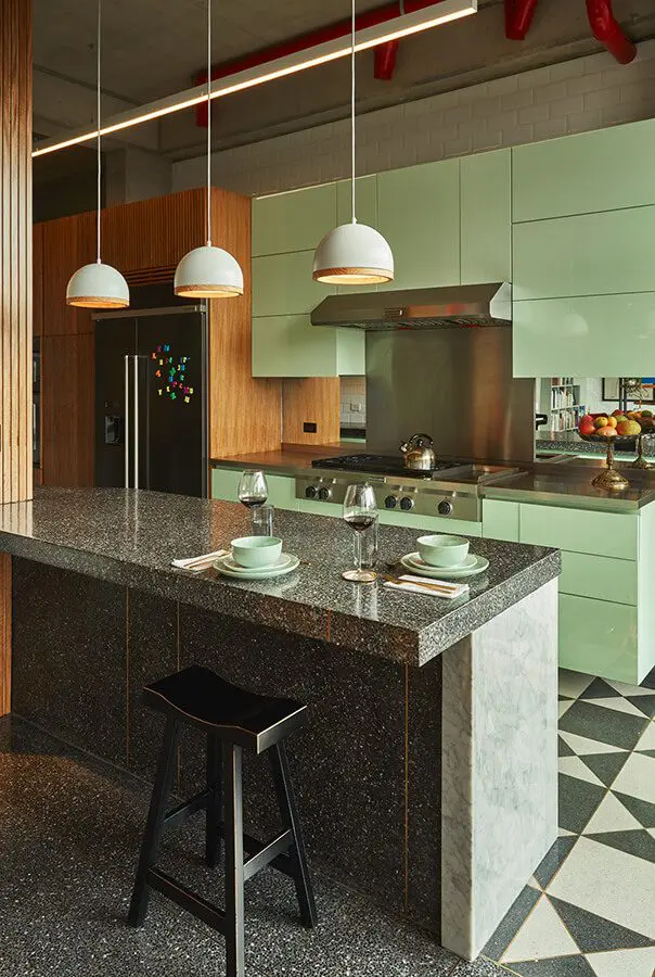Mesón y piso en terrazo diseñado por Jotaele arquitectura y realizado por el artesano Oscar Páez. Foto: Mónica Barreneche.