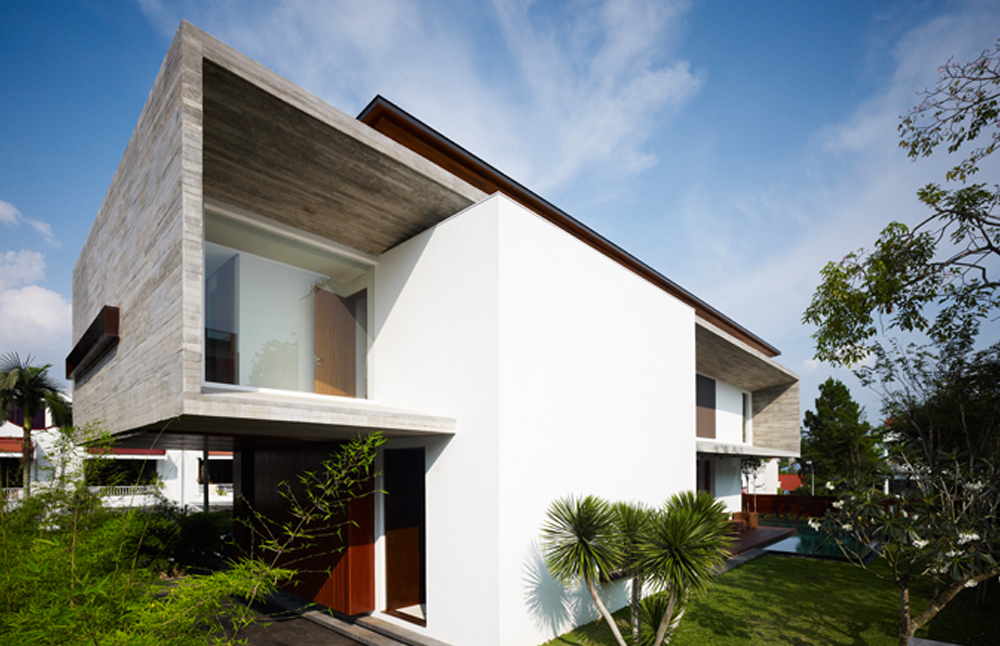Este último material, el más emblemático del proyecto, fue un reto constructivo ya que no es común su uso como acabado final en Singapur, así que se fundió el marco general y sobre el área inclinada se instalaron cientos de piezas prefabricadas modulares con la misma textura de la formaleta, en un proceso artesanal que contrasta con la idea preconcebida del uso industrial del hormigón. M-House, modernidad tropical