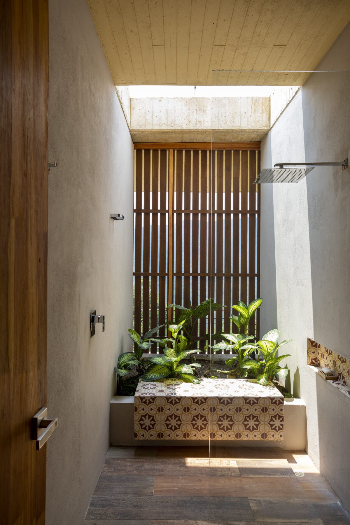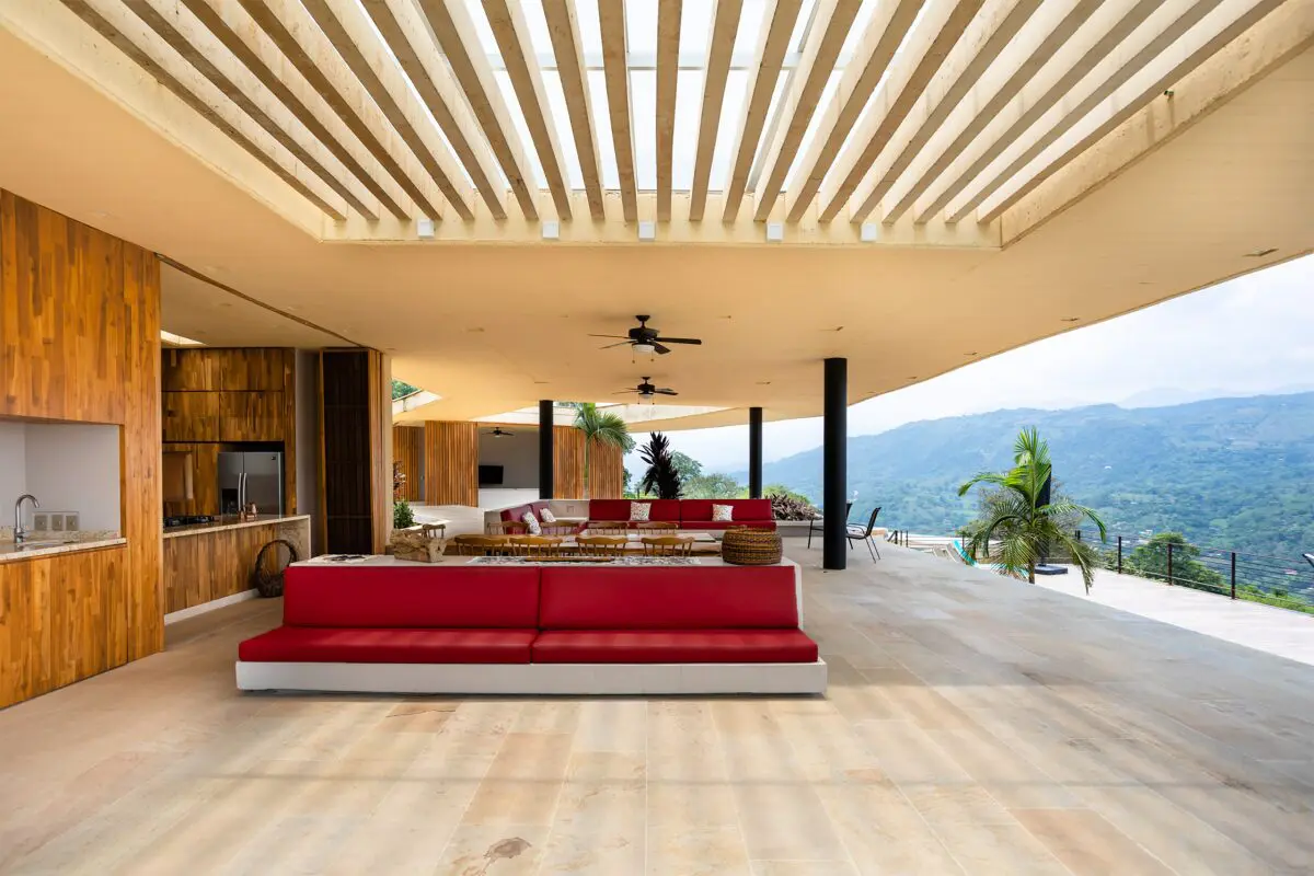 Al tomar de nuevo las escaleras se llega a la parte social de la casa, donde la ausencia de cerramientos de fachada la define como una gran terraza abierta, bajo una marquesina de concreto que la protege del sol. Hacia el costado oriental ubican una piscina en esquina que se articula con el salón, el comedor y la cocina. En el centro, un último patio hace un quiebre en la geometría de la planta para separar las estancias privadas, que se pueden abrir o cerrar gracias a sus fachadas plegables de madera. Junto con la empresa Arquiambiental hicieron un estudio bioclimático para garantizar las condiciones de ventilación y confort térmico en el proyecto.
