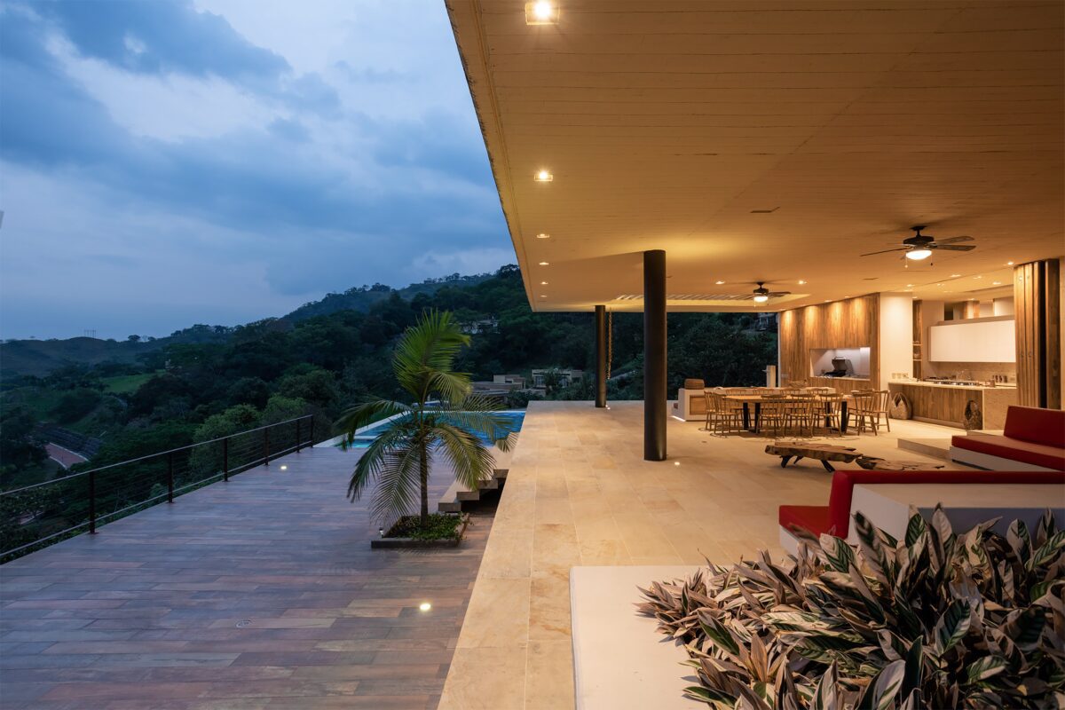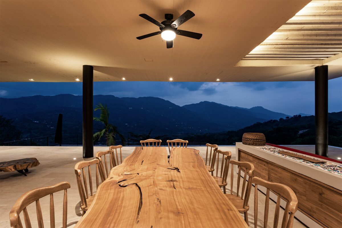 Desde las terrazas sociales el paso del tiempo es visible. Durante las horas nocturnas, la iluminación y la vegetación de la casa adquieren protagonismo.