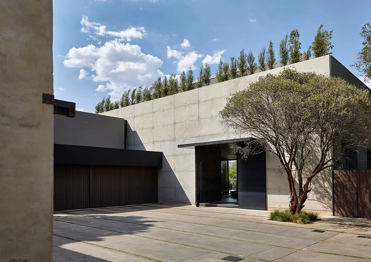 Esta casa en Hyde Park, suburbio de Johannesburgo, Sudáfrica, comienza con un misterio. Desde la entrada parece un monolito de hormigón alto, casi sin rasgos. Solo sobresale una gran puerta pivotante de acero, de aspecto mecánico y de 3,8 metros de altura. La vivienda, a primera vista, podría considerarse como un fuerte impenetrable que no está dispuesto a revelar lo que pasa en su interior.