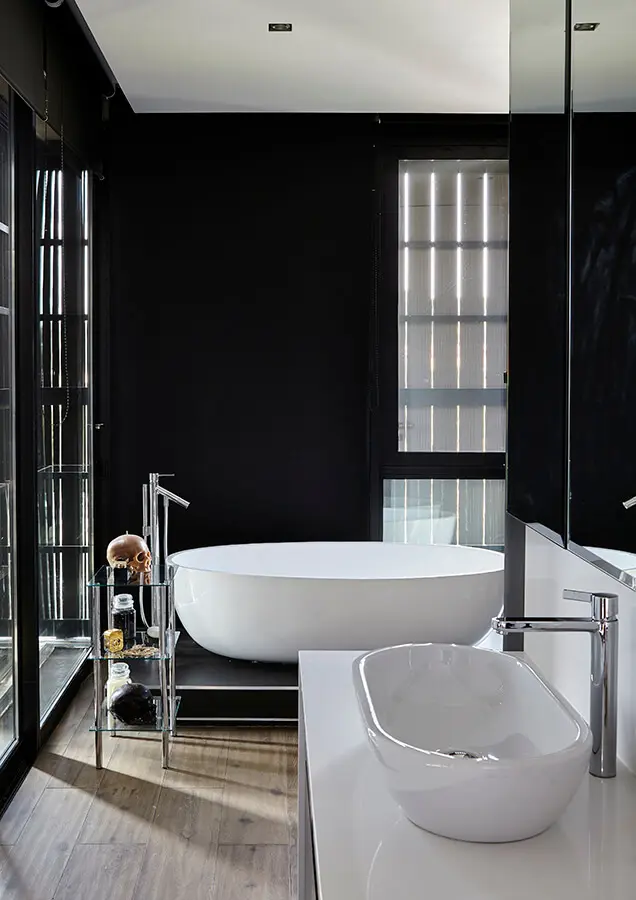 Toda la casa constituye un ensayo de contrastes, una capa cruda y otra fina para crear una tensión estimulante entre las dos. “Es una línea muy delgada entre ser audaz y emocionante o exagerado. La sensación de opulencia oculta el inteligente aprovechamiento del espacio. Básicamente, el concepto de este proyecto consiste en que sea un solo cuarto. El patio y la cocina no están separados. No tienes zonas diferentes. Puedes cambiarlo un poco al abrir o cerrar las puertas, pero en esencia se trata de un gran ambiente abierto. Es realmente sorprendente, generoso y lujoso”.