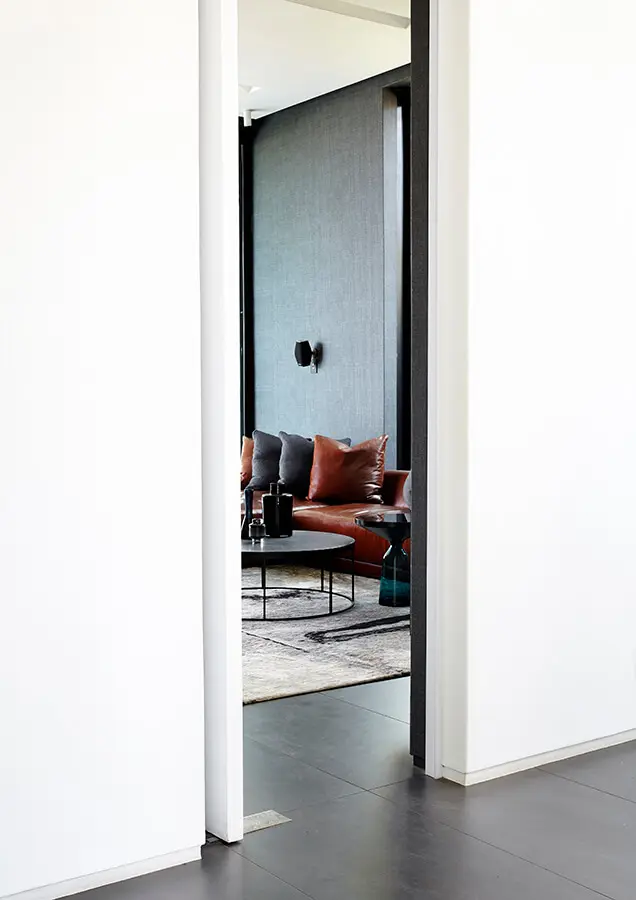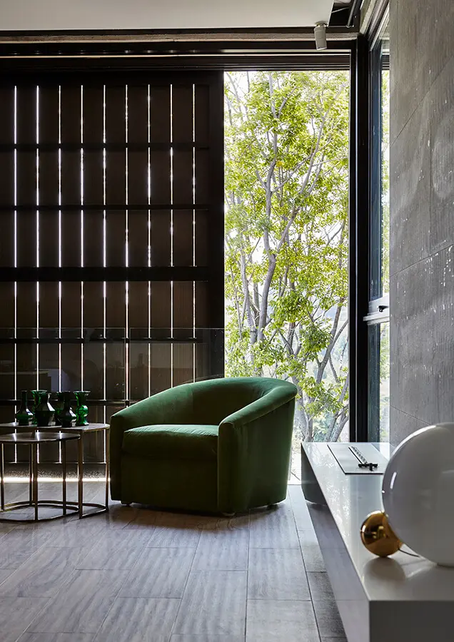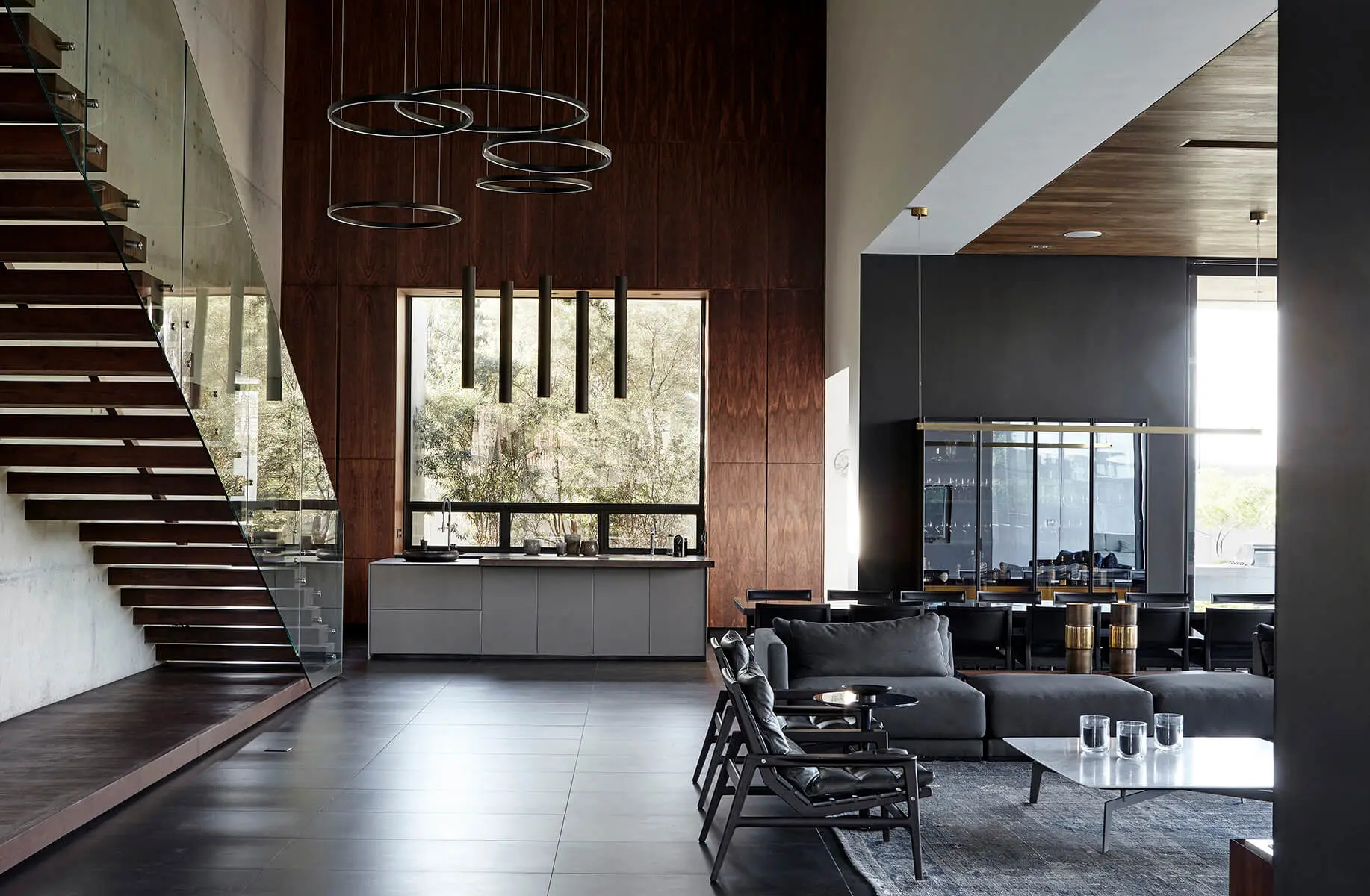 Al pasar el umbral de acceso, la persona descubre un volumen triple, con un pasillo de 7 metros de alto. “Es un espacio poderoso”, dice el arquitecto. Este ambiente tiene un balance entre la opulencia y la extravagancia casi exagerada, y el minimalismo y la simplicidad. El muro interior también es de hormigón a la vista, robusto, pero las escaleras de vidrio que parecen despegar en el aire agregan liviandad. Estas últimas son elementos elegantes y refinados que contrastan con la crudeza de otros. Además, en puntos estratégicos, techos y muros de madera aportan calidez.